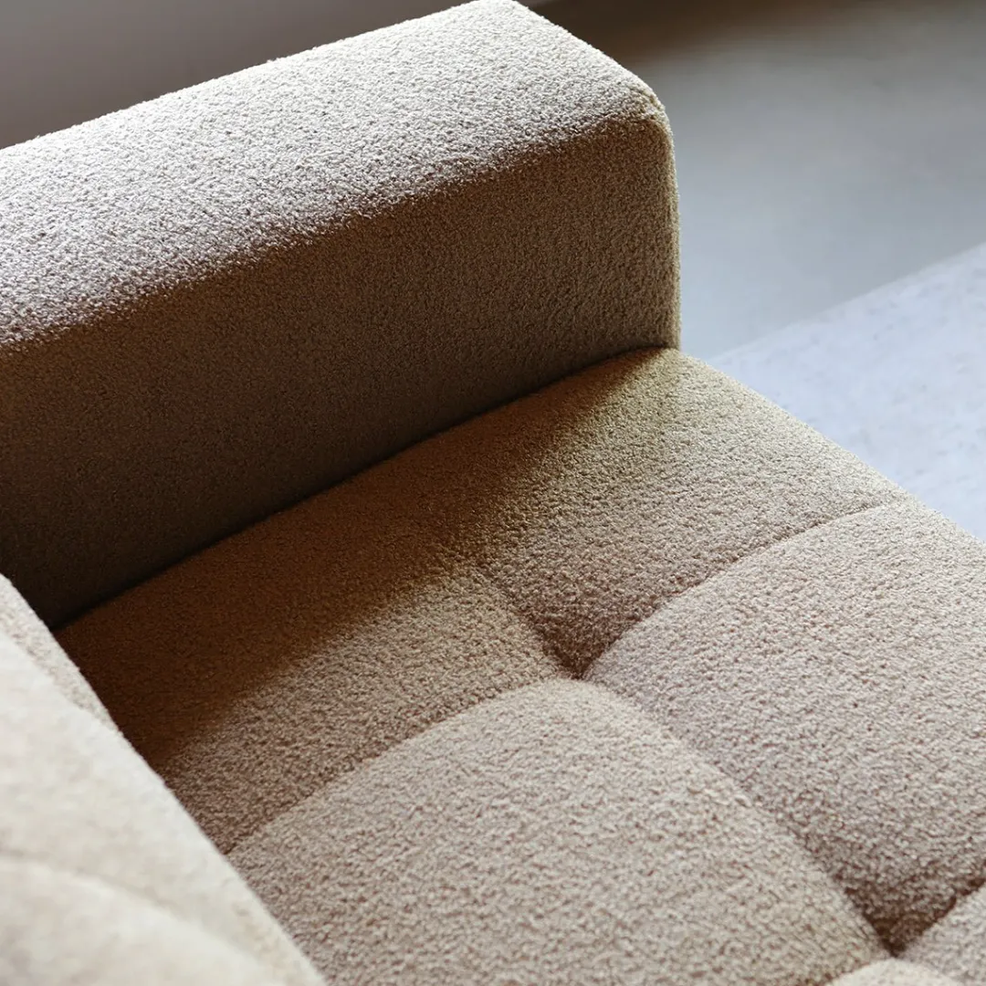 Geniet van ultieme luxe met de weelderige, gecapitonneerde zitting en rugleuning die ongeëvenaarde ondersteuning en verfijning bieden. De vaste zit- en rugkussens garanderen blijvend comfort, terwijl de zachte bruine teddy stof bekleding een vleugje warmte en elegantie toevoegt.