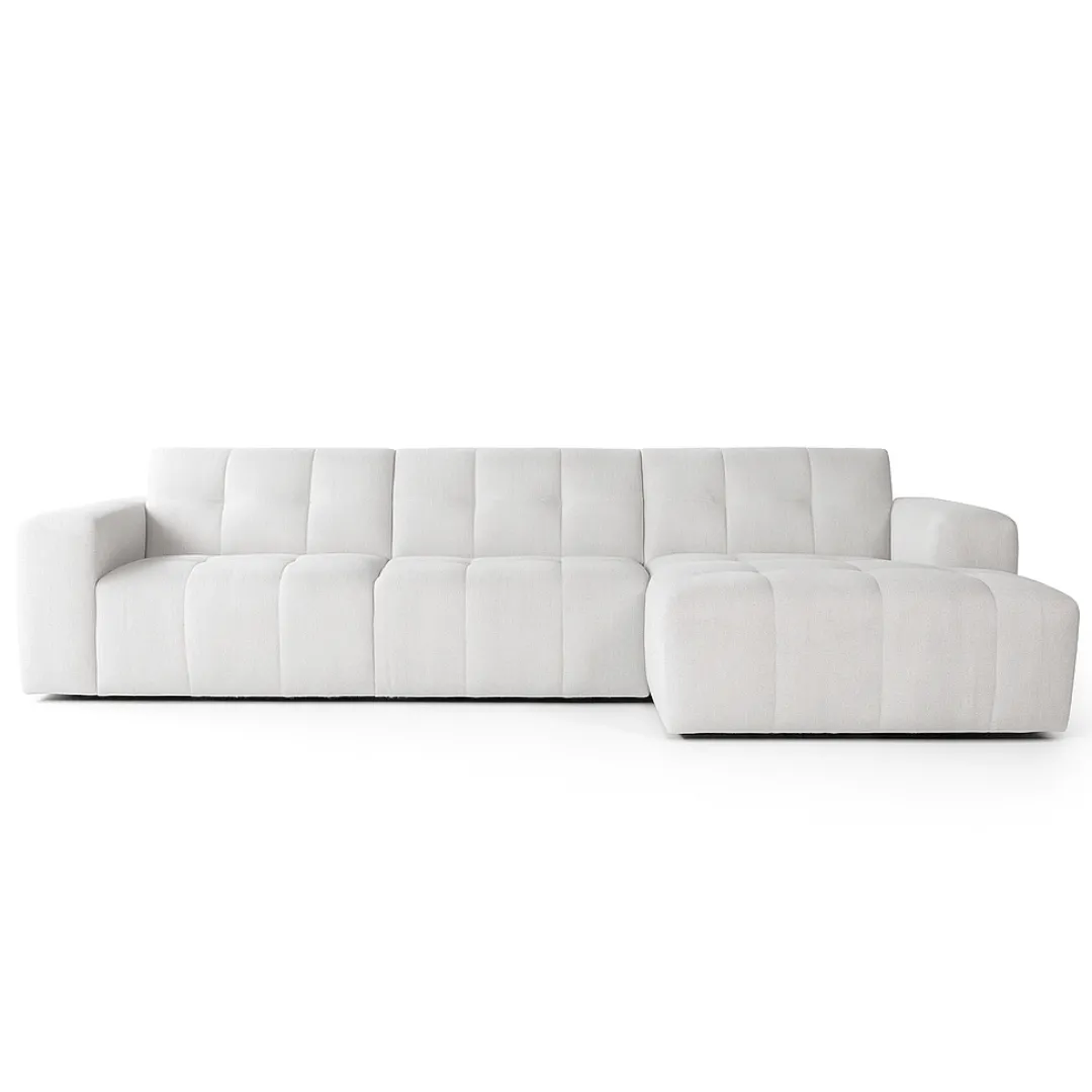De bekleding van geweven stof in een verfijnde ivoorkleur voegt een vleugje verfijning toe aan elk interieur. De bank bestaat uit twee losse delen – een divan en een 3-zits bank – die eenvoudig aan elkaar worden vastgeklikt, waardoor flexibiliteit en aanpasbaarheid worden gegarandeerd.