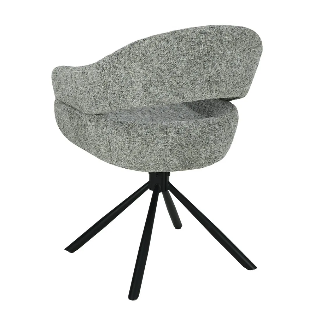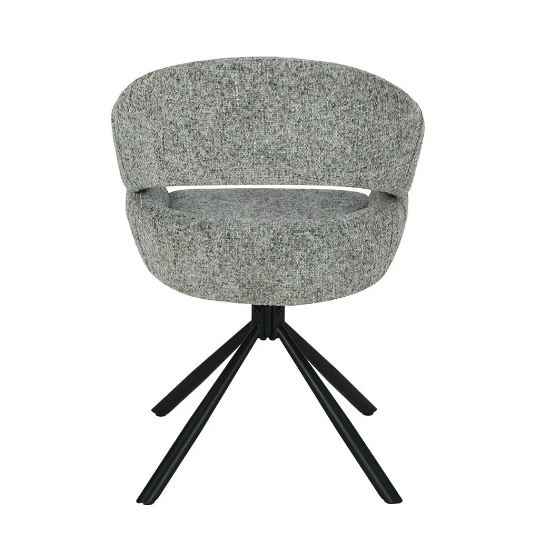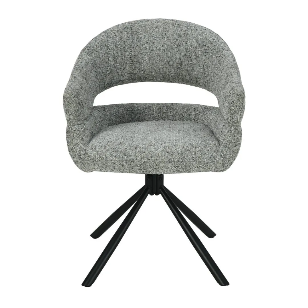 Eetkamerstoel Chinon Donkergrijs combineert stijl en comfort in één ontwerp. De donkergrijze stoffen bekleding geeft de stoel een moderne uitstraling, terwijl het zwart gepoedercoate metalen onderstel een stoer accent toevoegt. De armleuningen zorgen voor extra ondersteuning en een fijne zitervaring.