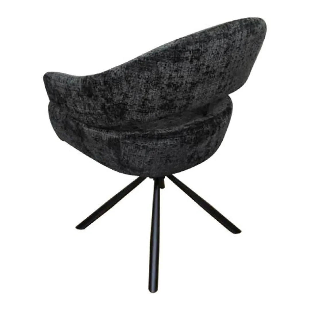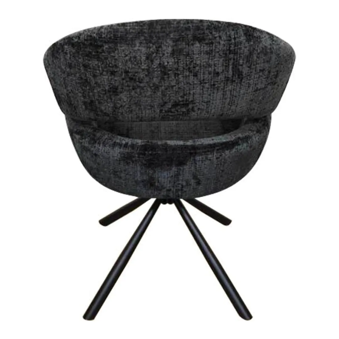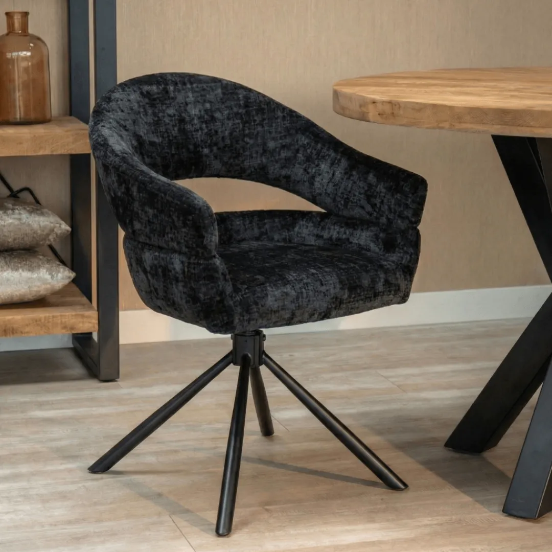Eetkamerstoel Chinon Zwart combineert stijl en comfort in één ontwerp. De zwart stoffen bekleding geeft de stoel een moderne uitstraling, terwijl het zwart gepoedercoate metalen onderstel een stoer accent toevoegt. De armleuningen zorgen voor extra ondersteuning en een fijne zitervaring.