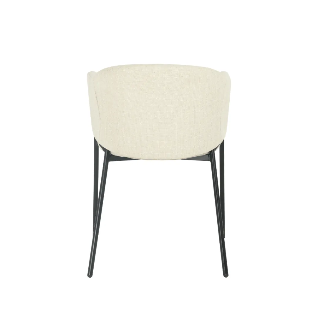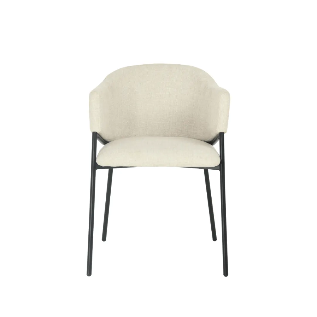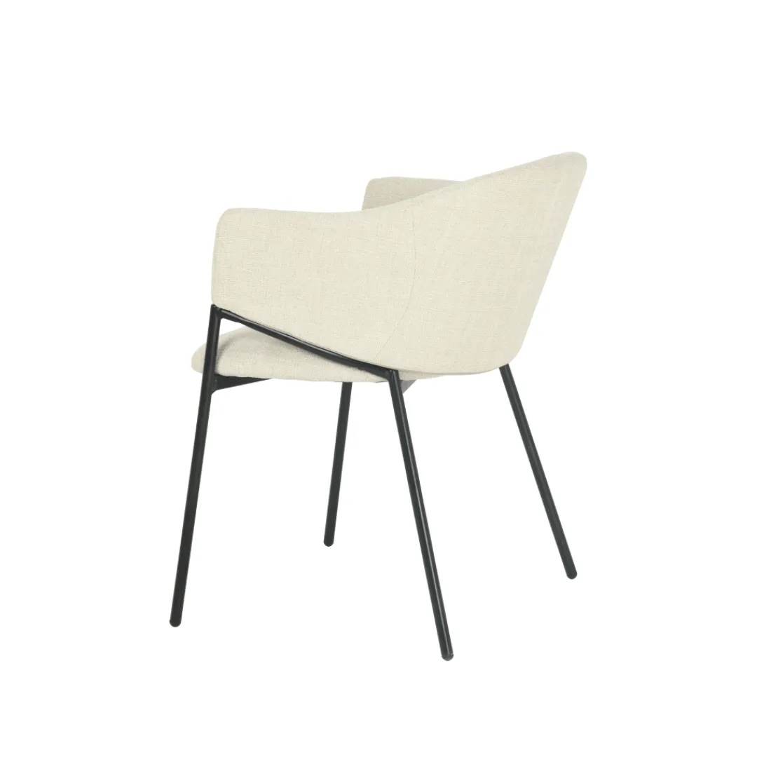 De combinatie van de linnen bekleding in een stijlvolle beige tint en het strakke metalen onderstel in het zwart resulteert in een eigentijdse en verfijnde uitstraling. Deze stoel is niet alleen een lust voor het oog, maar is ook ontworpen met duurzaamheid in gedachten. Het stevige zwarte onderstel biedt stabiliteit, terwijl de linnen bekleding zorgt voor een zachte en comfortabele zitervaring.