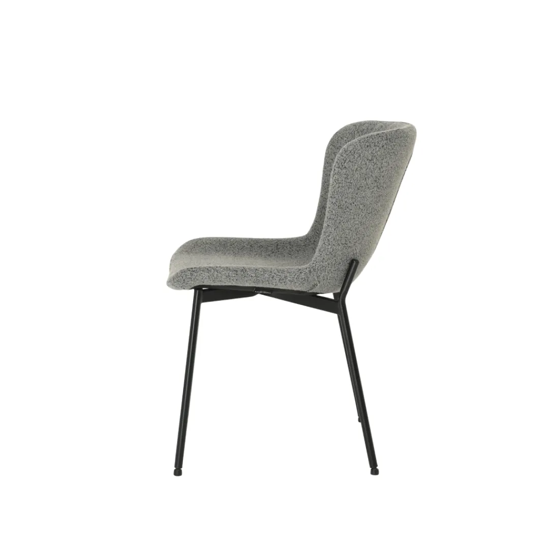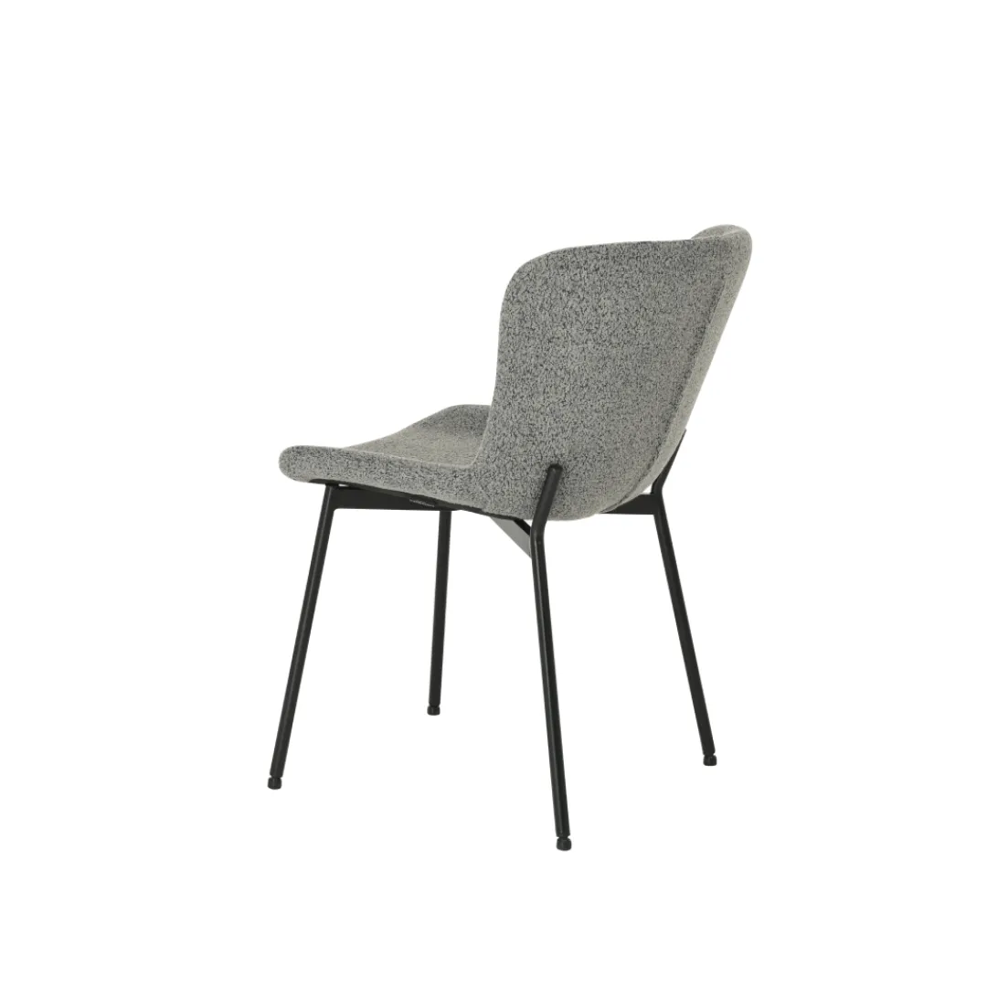 Creëer een verfijnde eetkamer met de Lille eetkamerstoel in de kleur donkergrijs. De zachte bouclé stof bekleding in deze elegante tint voegt een vleugje luxe toe aan je interieur.