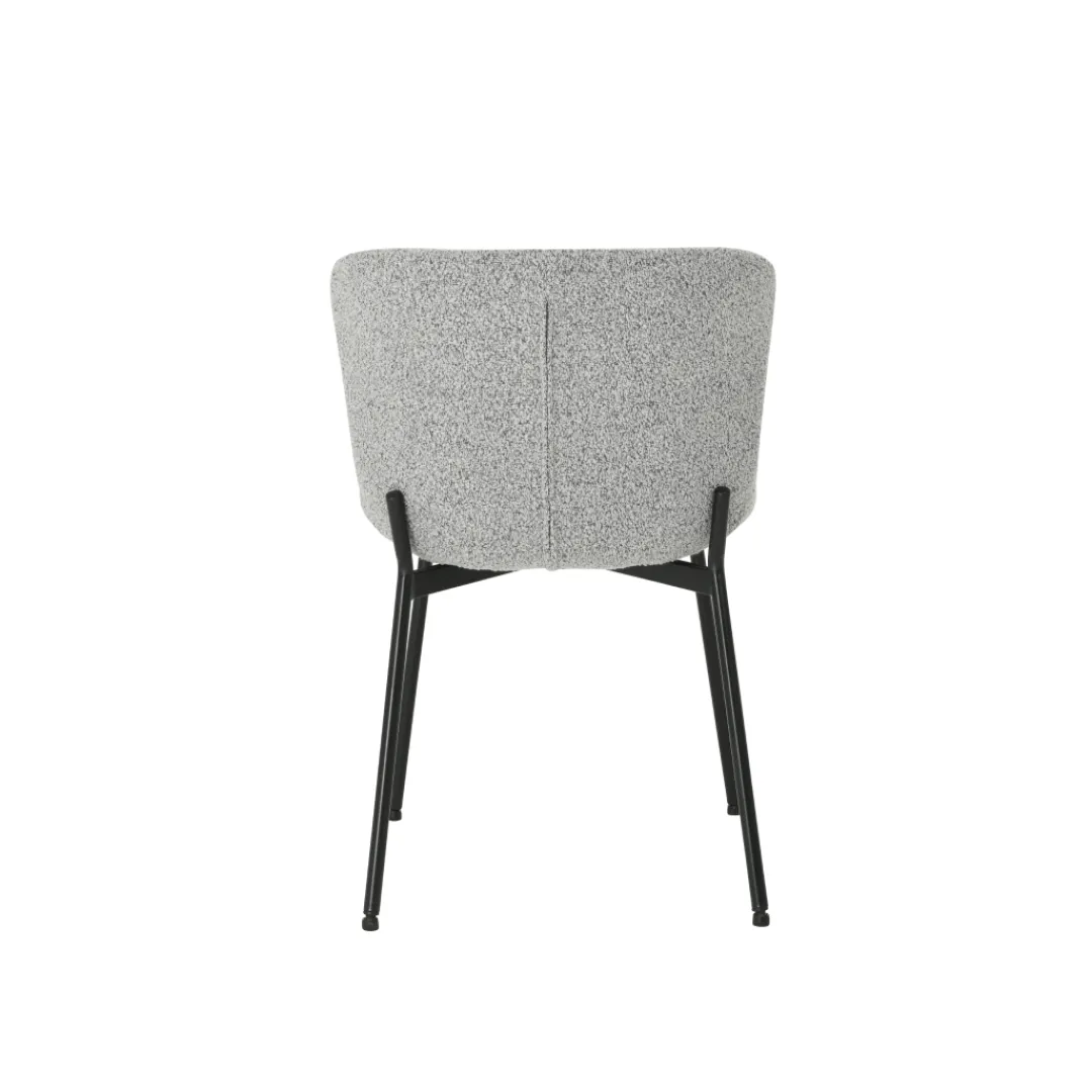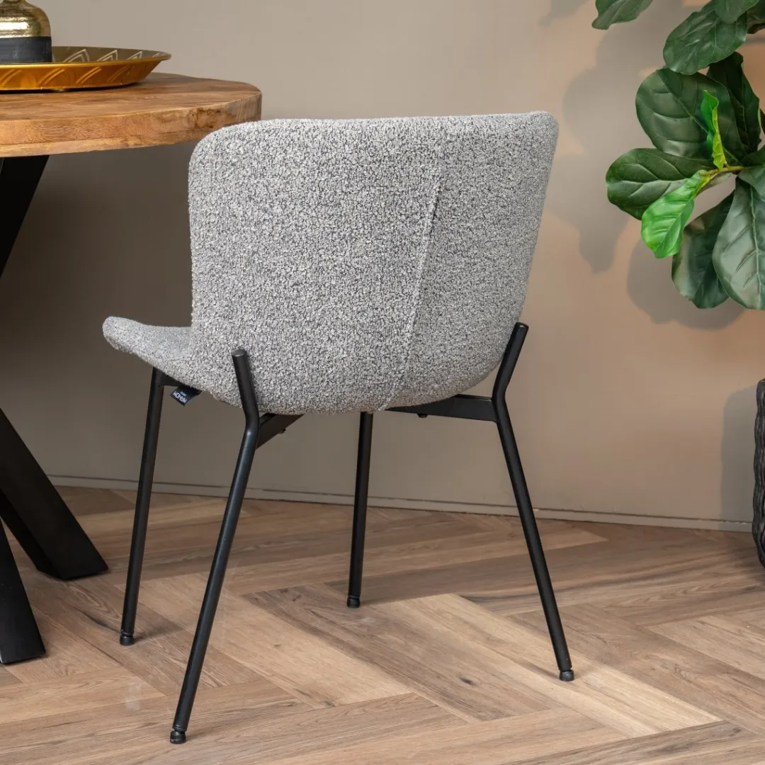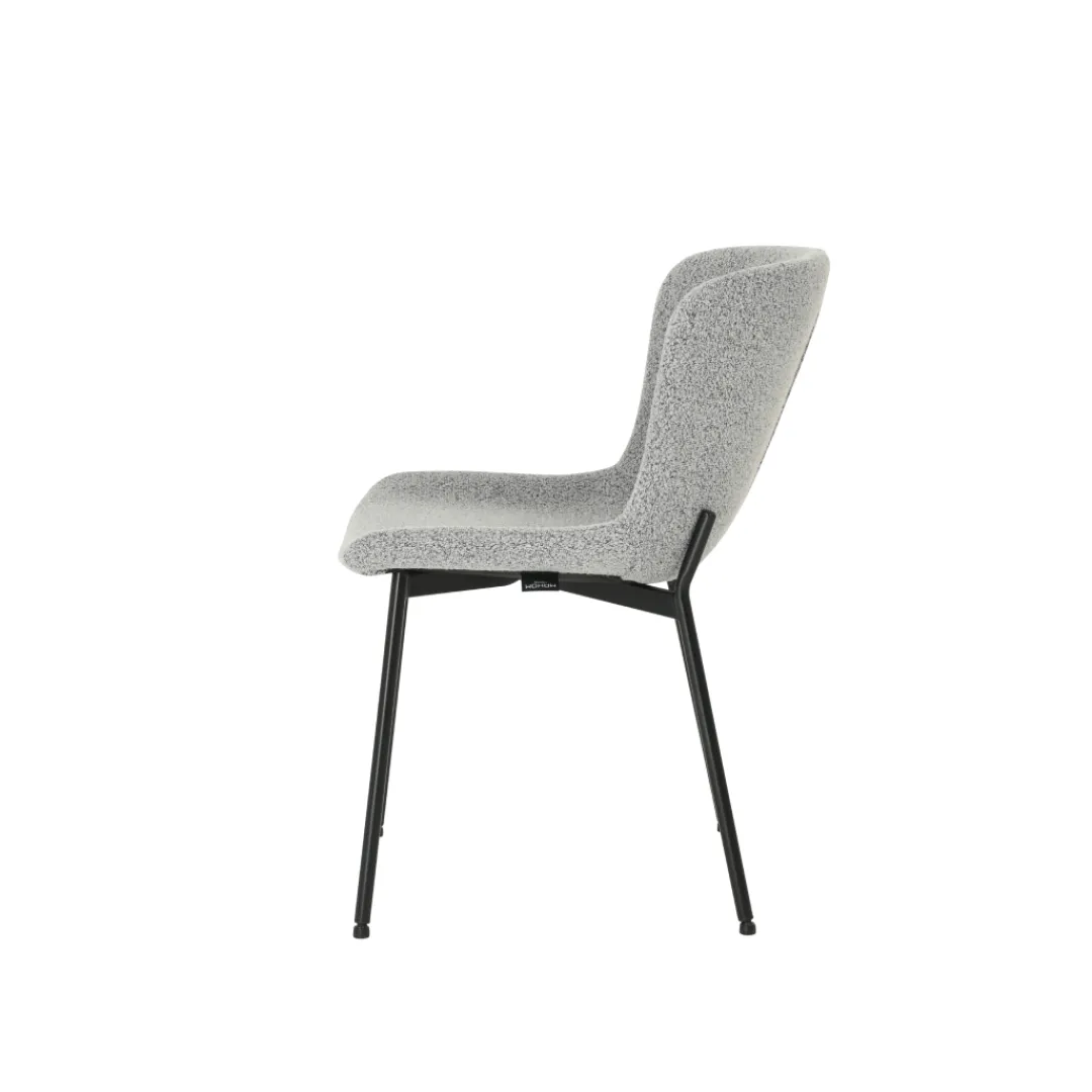 Voeg een vleugje lichtheid toe aan je eetkamer met de Lille eetkamerstoel in de kleur lichtgrijs. De bouclé stof bekleding in deze subtiele tint creëert een rustige en ontspannen sfeer.