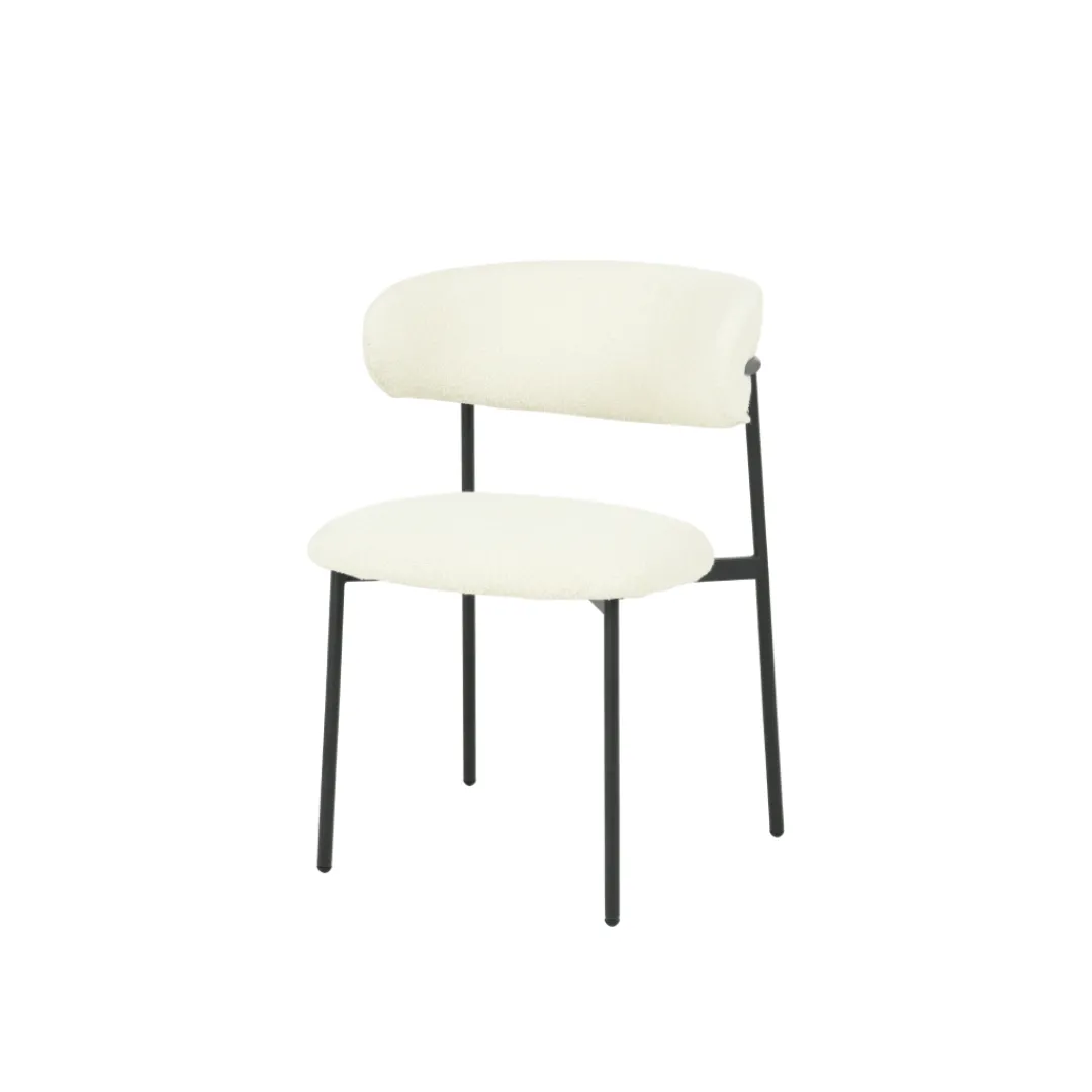 Het zwarte onderstel biedt stabiliteit en vormt een mooi contrast met het witte teddy stof. Combineer deze stoel met een mangohouten eettafel voor een verfijnde en eigentijdse look.