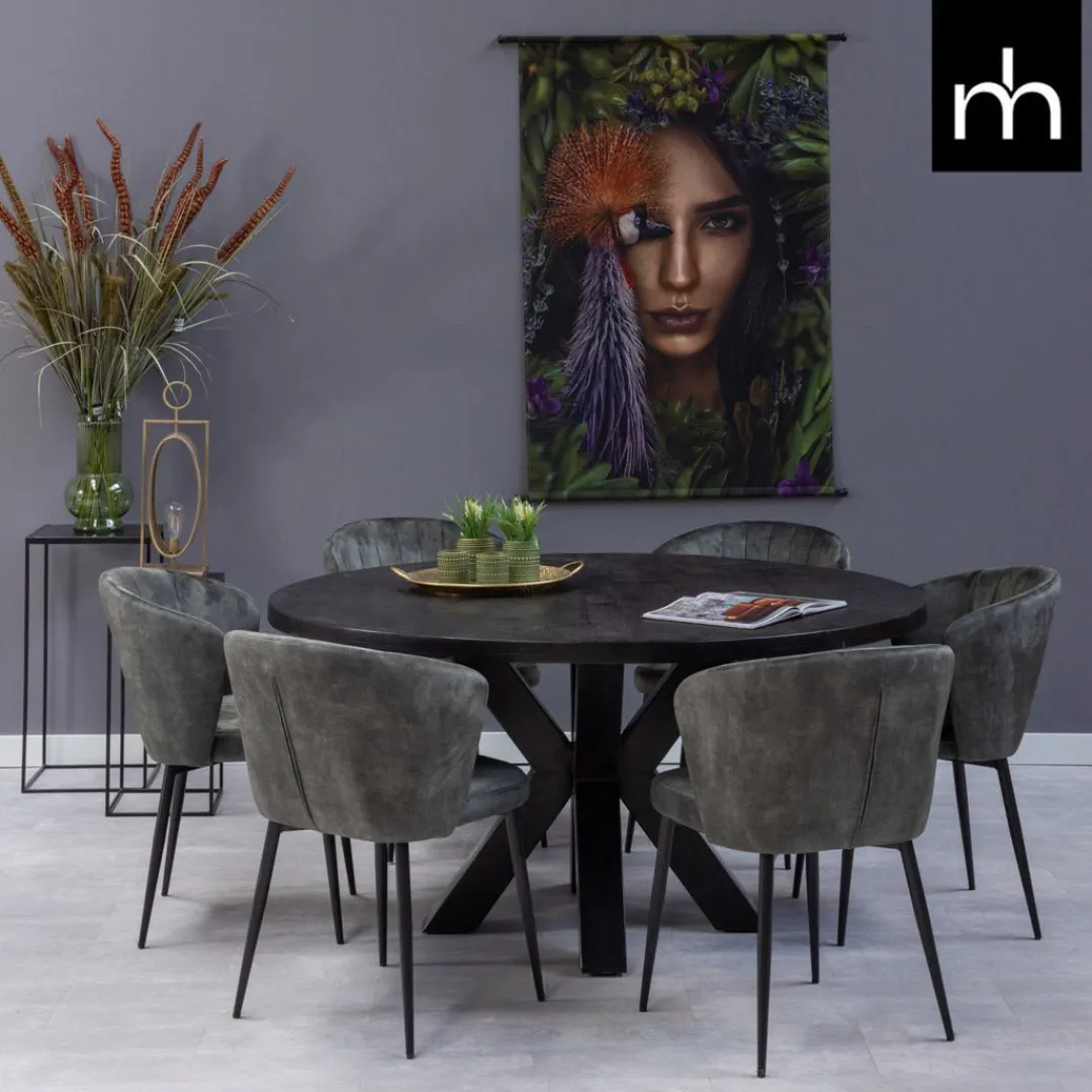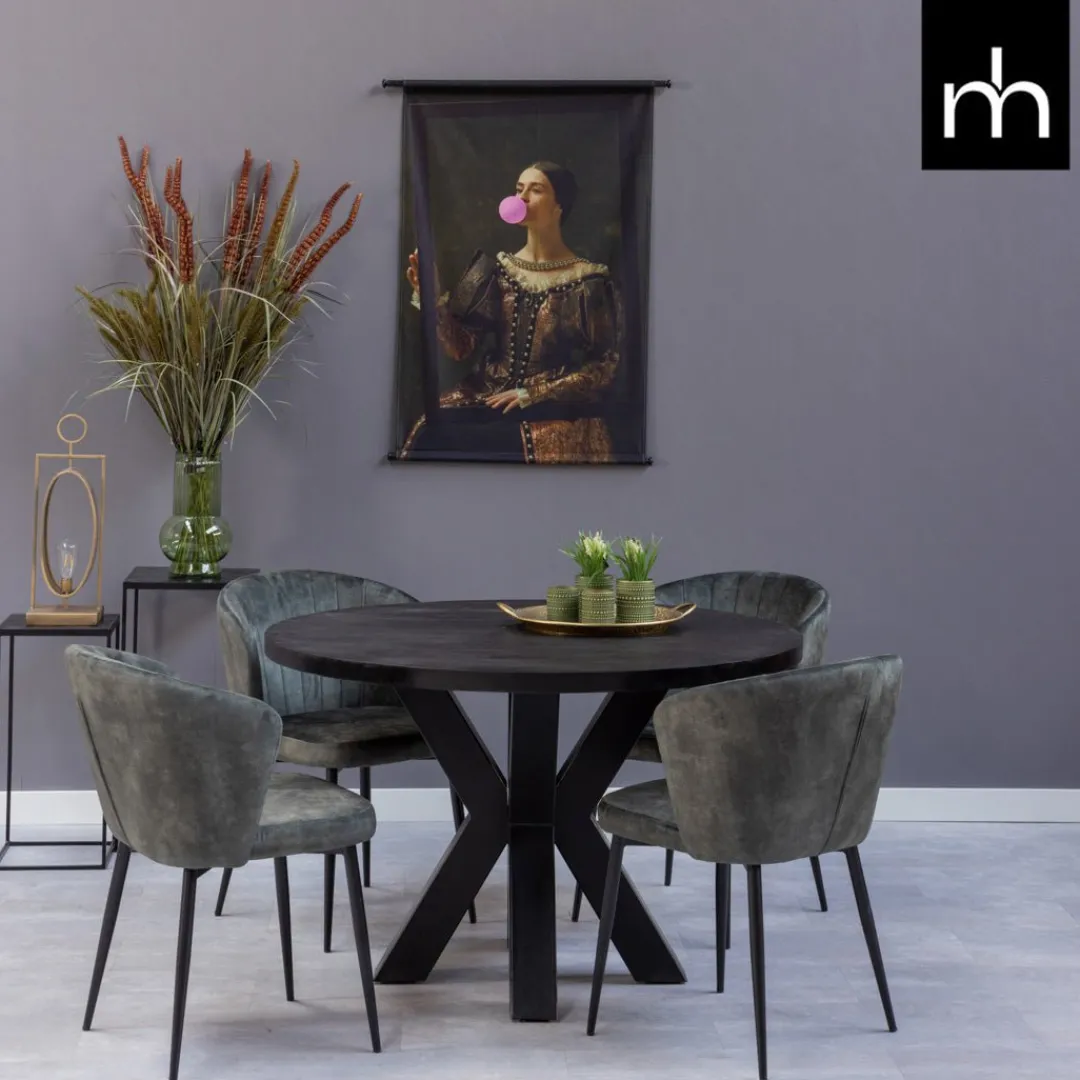 Velvet wordt gemaakt van katoen of zijde. De stof wordt geweven, zodat er kleine, opstaande lusjes ontstaan. Deze lussen worden vervolgens doorgeknipt, waardoor er kleine haartjes ontstaan die erg zacht aanvoelen. Hierdoor krijgt het velvet zijn karakteristieke chique uiterlijk. De poten zijn gemaakt van zwart gepoedercoat metaal.