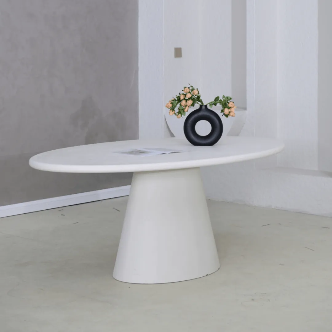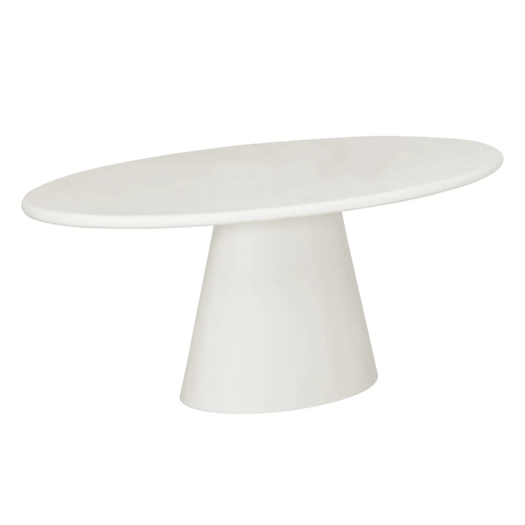Eettafel Savannah Ovaal is een elegante tafel die direct sfeer brengt in je eetkamer. Het ovale blad en de stevige voet zijn volledig uitgevoerd in microcement en afgewerkt in een zachte wit tint. Deze combinatie geeft de tafel een moderne, maar tegelijkertijd rustige uitstraling die mooi aansluit bij verschillende interieurstijlen.