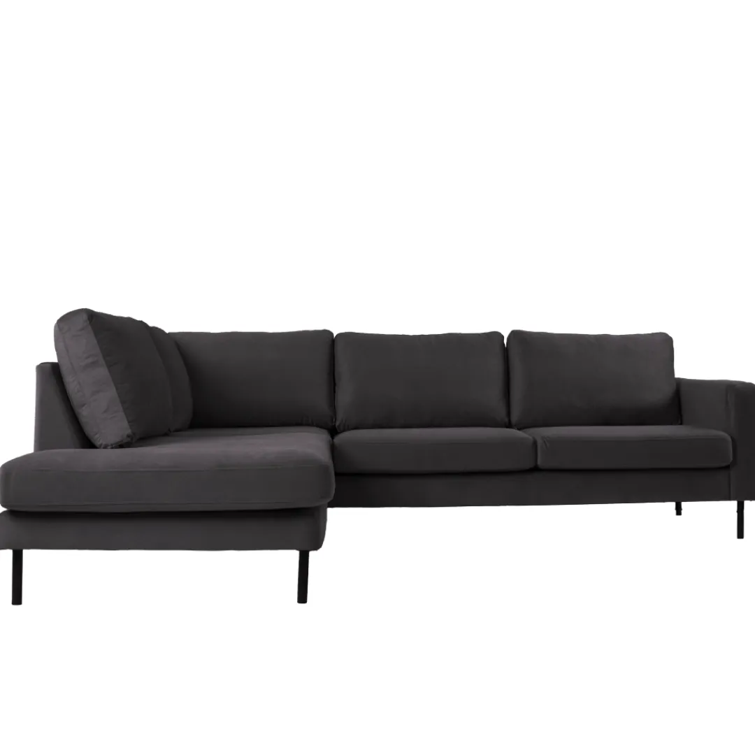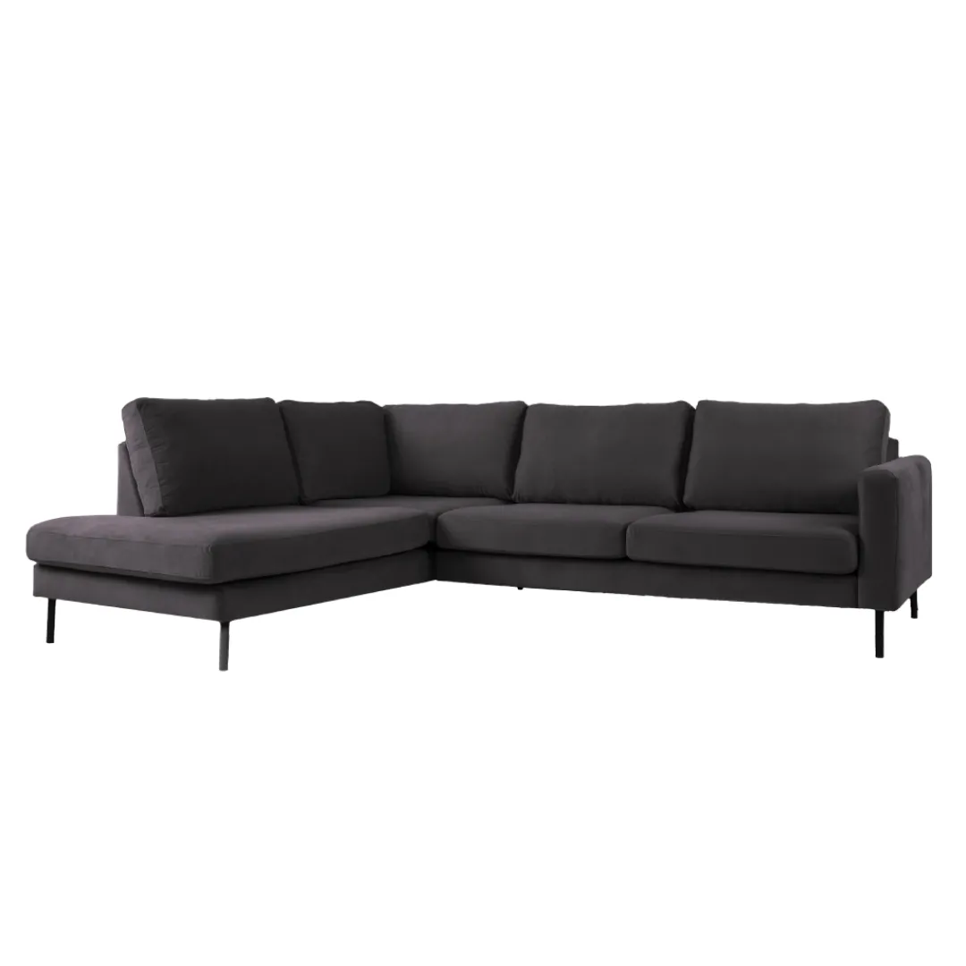 Breng warmte en elegantie in je interieur met hoekbank Sterre. Deze moderne L-vormige bank straalt klasse uit en biedt royaal comfort voor het hele gezin. Dankzij de zachte velours bekleding en het strakke design is Sterre dé eyecatcher in elke woonkamer.