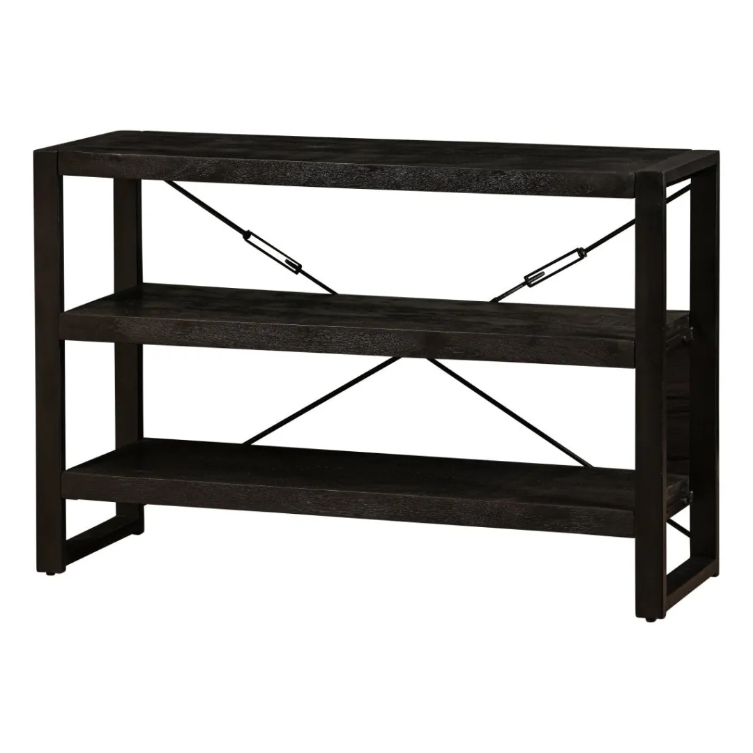 Deze lage boekenkast uit de Britt-collectie neemt door zijn compacte formaat weinig ruimte in, maar biedt genoeg ruimte voor je meest waardevolle boeken of andere spullen. Het zwarte mangohout geeft de kast een stoer karakter en de stalen frames maken het geheel daarnaast helemaal af. Door de open achterkant leent het meubel zich ook goed als TV meubel.