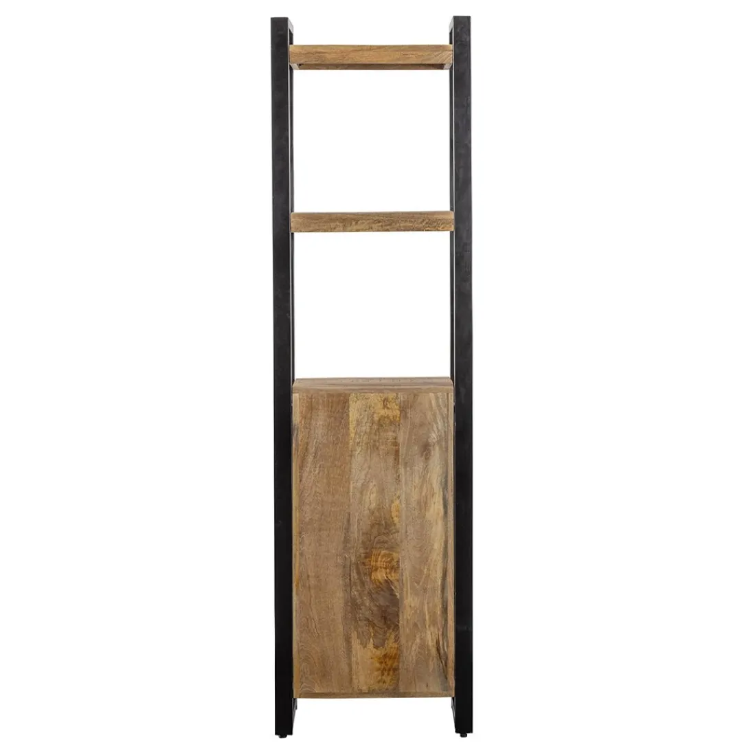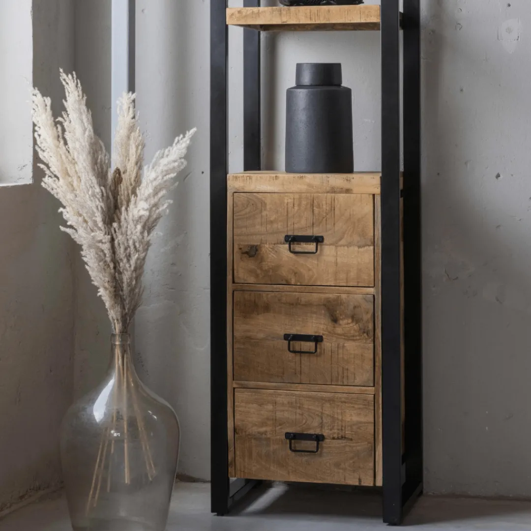 Een smalle, maar stoere kast waar door de compacte vorm altijd wel een plekje voor te vinden is. De kast is misschien niet breed, maar heeft alsnog veel opbergruimte door de twee open vakken en de drie lades.
