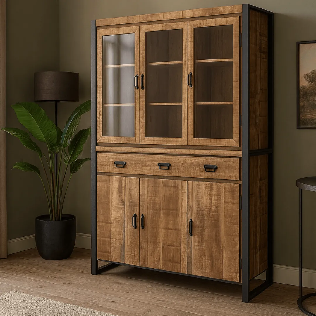 Op zoek naar een robuuste en stijlvolle opbergoplossing voor je interieur? De Mangohouten Buffetkast Britt biedt de perfecte combinatie van functionaliteit en design. Deze wandkast is gemaakt van duurzaam mangohout en voorzien van handvaten en een frame van zwart gepoedercoat metaal. Dit geeft de kast een stoer, industrieel karakter dat in verschillende woonstijlen past.