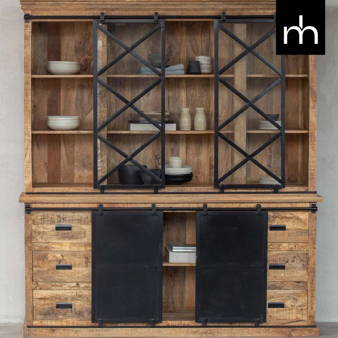 Over het massieve mangohout worden meerdere lagen houtolie en een blanke, natuurlijke bijenwas aangebracht om het hout te beschermen tegen vocht, vuiligheid en kringen. Het frame van de glazen schuifdeuren, de onderste schuifdeurtjes en de handgrepen zijn allemaal gemaakt van zwart gepoedercoat metaal.