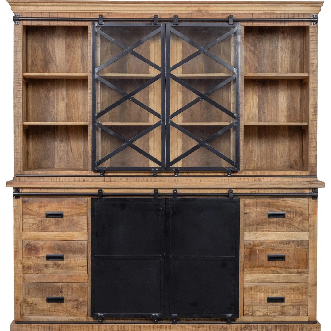 Deze stoere, krachtige buffetkast zal door iedereen gezien worden! De kast heeft een fraai uiterlijk door het warme mangohout en de zwartmetalen accenten. De bovenkant bestaat uit zes kleine vakken aan de zijkanten en drie grote vakken in het midden. De twee glazen schuifdeurtjes zorgen ervoor dat je zelf bepaalt welk deel van je uitgebreide serviescollectie afgeschermd moet worden. Het onderste gedeelte van de buffetkast bestaat uit twee vakken achter de stalen schuifdeuren en zes lades om allerlei kleinere voorwerpen eenvoudig op te ruimen.