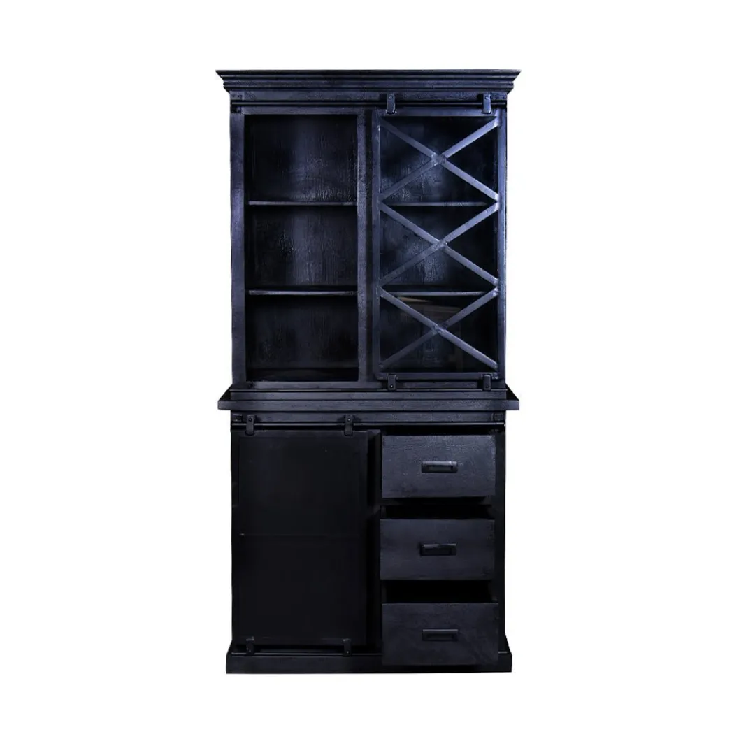 Onze Denver-buffetserie is ook in het zwart verkrijgbaar wat de keuze alleen nog maar moeilijker maakt! Deze fraaie kast van zwart mangohout en metaal werkt uitstekend samen met de rest van je meubilair en past met zijn formaat ook nog eens in elke ruimte! De bovenkant bevat drie grote vakken en door de schuifdeur met x-frame voor het raam kan je zelf bepalen wel deel afgeschermd moet worden. Aan de onderkant is er voldoende ruimte om accessoires op te bergen in de drie lades en in de open vakken achter de stalen schuifdeur.