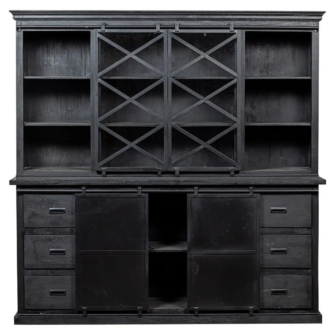 Deze stijlvolle zwarte buffetkast is zowel 220 cm breed als 220 cm hoog. Door de combinatie van het zwarte mangohout met het zwarte metaal, straalt het echte luxe uit en zal het servies nog beter te zien zijn! Het bovenste gedeelte bevat zes kleinere vakken aan de zijkanten en drie grote vakken in het midden. Je kan een deel van het servies eenvoudig afschermen dankzij de dubbele glazen schuifdeur met x-frame voor de ramen. Het onderste gedeelte bevat zes lades en twee grote vakken achter de stalen schuifdeuren, waarin voldoende ruimte is om allerlei eigendommen te bewaren.