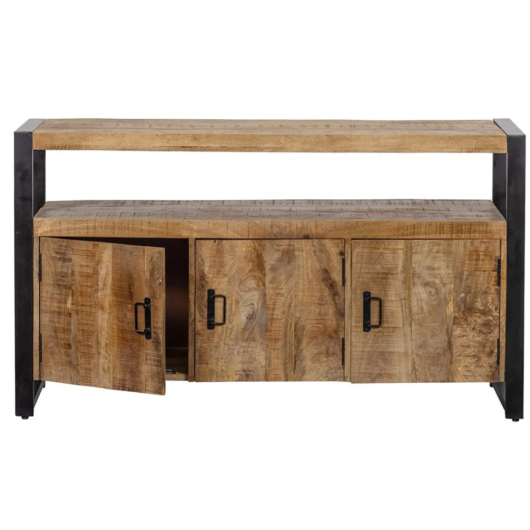 Dit robuuste dressoir uit de Britt-serie beschikt over drie ruime vakken achter de deurtjes waarin van alles opgeslagen kan worden. De open tussenruimte biedt veel ruimte om apparatuur te plaatsen, waardoor het dressoir ook geschikt om is als tv-meubel gebruikt te worden.