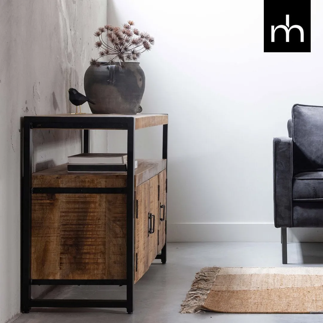 Over het massieve mangohout worden meerdere lagen houtolie en een blanke, natuurlijke bijenwas aangebracht om het hout te beschermen tegen vocht, vuiligheid en kringen. De frames en de handgrepen van de deurtjes zijn gemaakt van zwart gepoedercoat metaal.
