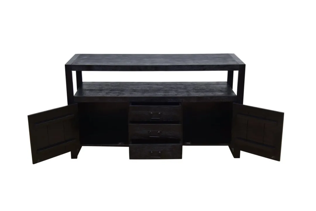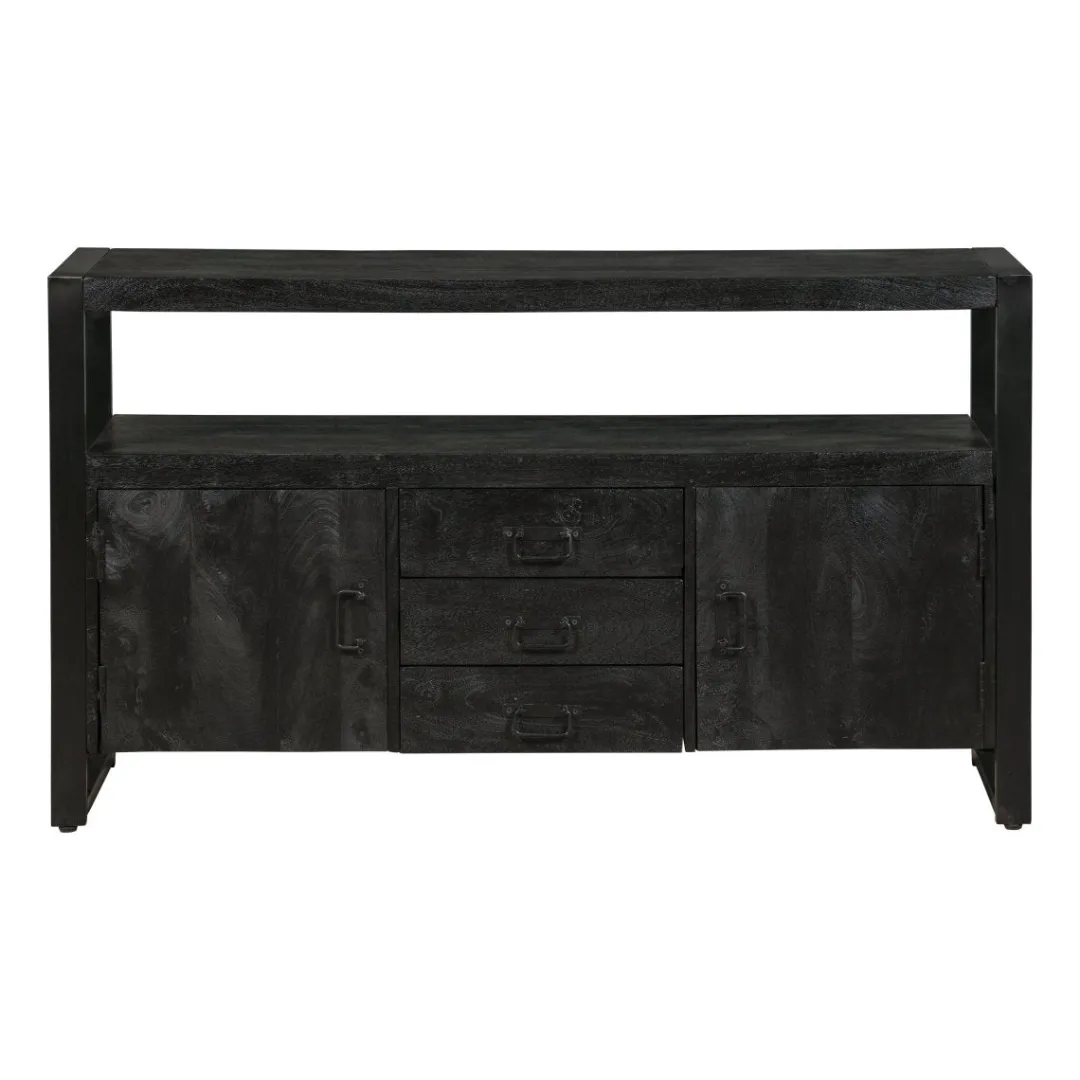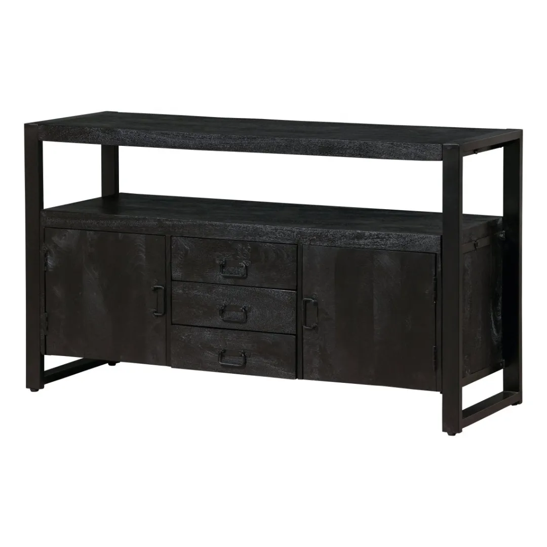 Dressoir Britt is stijlvol en stoer tegelijk. Met twee deurtjes en drie lades daartussenin biedt dit dressoir genoeg ruimte voor zowel wat grotere als kleinere spullen die je liever niet in het zicht hebt liggen. De tussenruimte en het blad kunnen eventueel gebruikt worden voor decoratie om het dressoir helemaal naar jouw smaak te maken. Ook kan het meubel gebruikt worden als TV meubel.