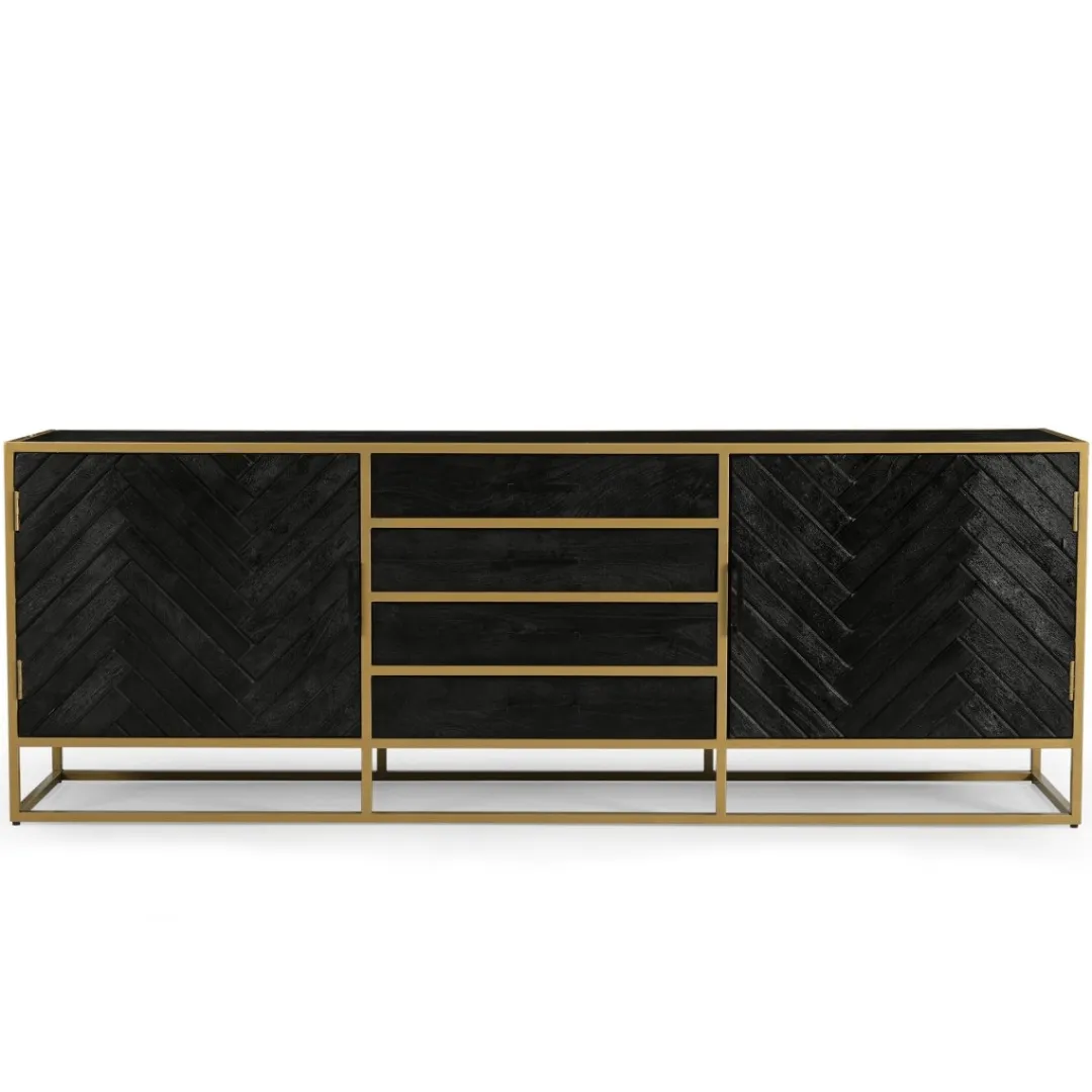 Dit ruimtelijke dressoir uit onze uitgebreide Napels-collectie zal de toon aangeven in elke ruimte. Het dressoir heeft een visgraat patroon met gouden accenten op de deurtjes en heeft daardoor een chique en luxueuze uitstraling. Het dressoir heeft twee deuren en vier lades en biedt voldoende ruimte om jouw spullen in op te bergen.