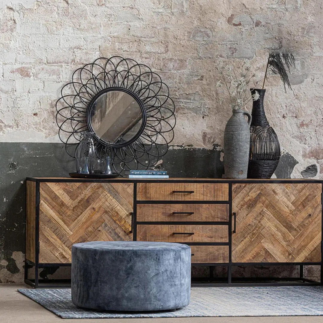 De houten deurtjes zijn voorzien van een visgraatpatroon, wat de kast een stijlvolle uitstraling geeft. Over het massieve mangohout worden meerdere lagen houtolie en een blanke, natuurlijke bijenwas aangebracht om het hout te beschermen tegen vocht, vuiligheid en kringen. Het frame en de handgrepen zijn gemaakt van zwart gepoedercoat metaal.