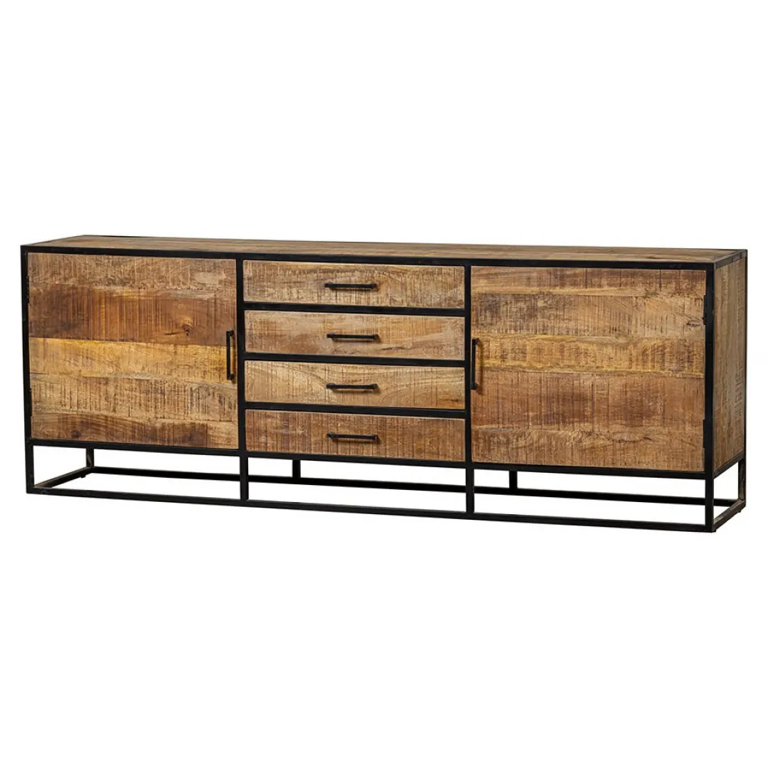 Dit stoere, ruime dressoir uit de San Antonio-collectie is meer dan een gewoon dressoir! Het meubel heeft een krachtig uiterlijk door de combinatie van de stalen elementen met het warme mangohout. Het bovenblad kan gebruikt worden om mooie decoraties te plaatsen zodat de ruimte helemaal naar jouw wens is. De kast beschikt over vier lades en twee brede deurtjes met achter beide deurtjes twee ruime vakken, waardoor er genoeg opbergmogelijkheden zitten in het dressoir.