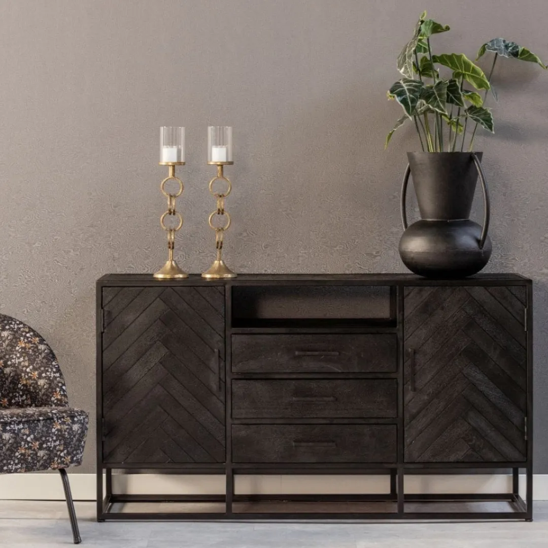 Als je op zoek bent naar een stijlvol dressoir, dan is dressoir Toronto wellicht de perfecte oplossing. Het visgraatmotief geeft dit smalle dressoir een zeer elegante uitstraling waardoor het meubel direct de aandacht zal trekken. Zo kan een klein meubel toch het pronkstuk van je interieur zijn. Ondanks dat het meubel vrij smal is, beschikt het over veel opbergmogelijkheden in de drie lades en de twee ruimtes achter de deurtjes. Het open vak kan een handige plek zijn voor bijvoorbeeld apparatuur.