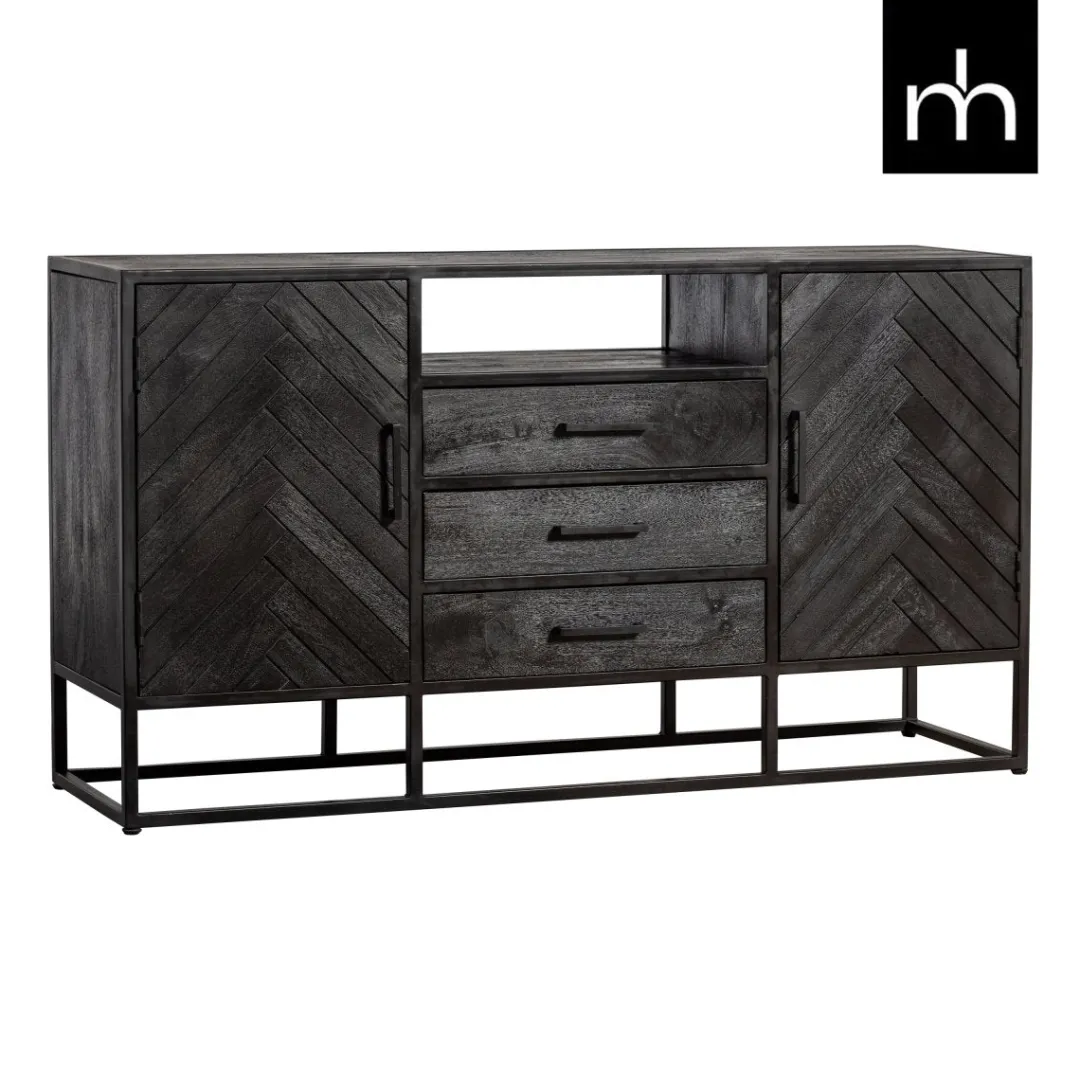 Het massieve mangohout is eerst gezandstraald, daarna behandeld met zwarte verfbeits en tenslotte afgewerkt met een donkere natuurlijke bijenwas, zodat het hout beschermt is tegen vocht, vuil en kringen. Het frame en de handgrepen zijn gemaakt van zwart staal dat is afgewerkt met een zwarte poedercoating.