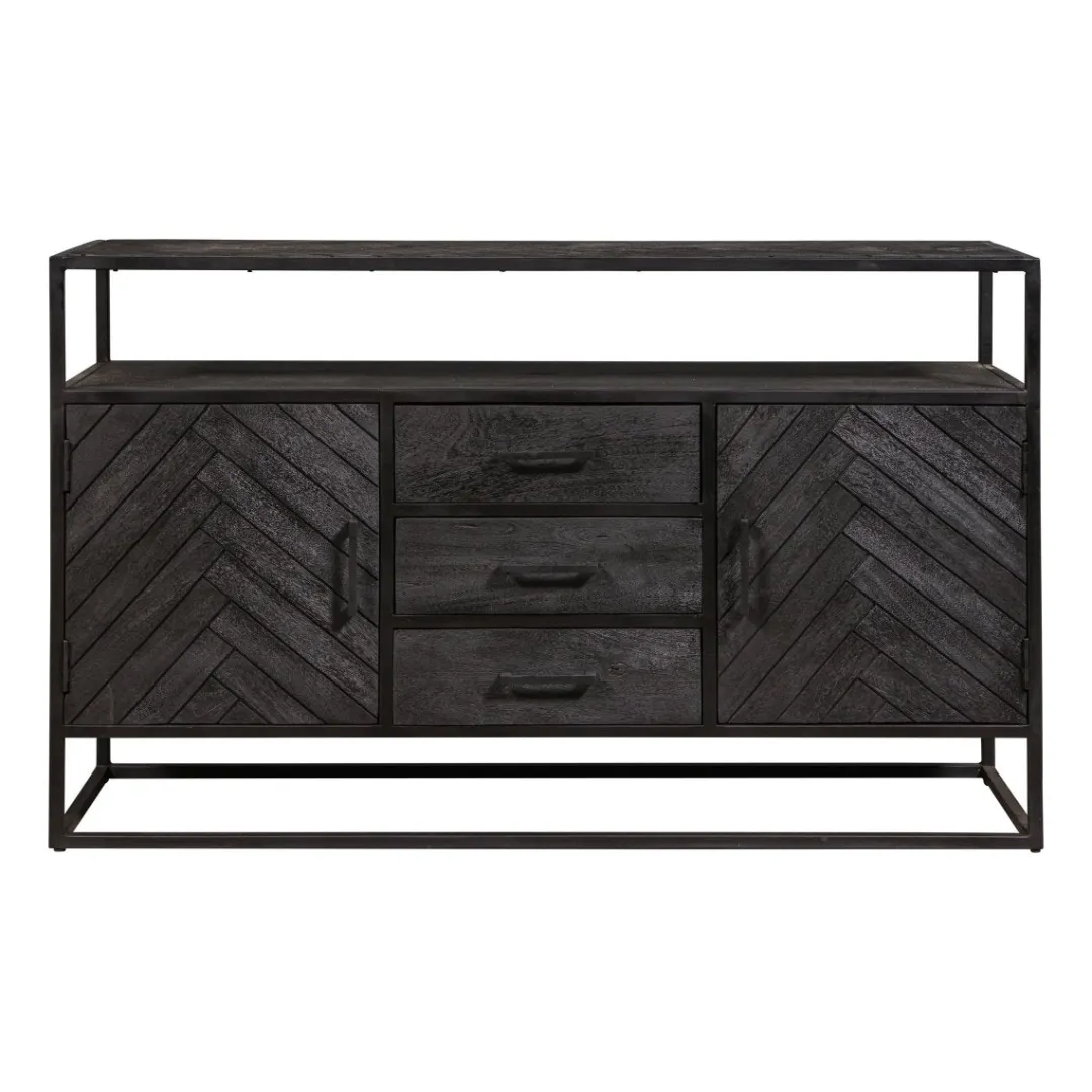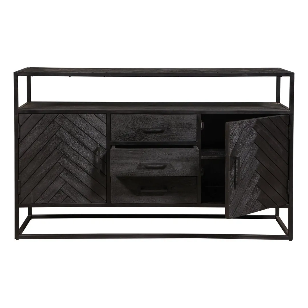 Dit schitterende dressoir uit de Toronto-serie heeft een uniek en eigentijds design. Het ruimtelijke metalen frame laat het meubel perfect passen in een industrieel interieur en het visgraatmotief geeft het geheel een stijlvolle twist. Door de speelse indeling kan je veel kanten op met dit meubel. Zo zijn er genoeg opbergmogelijkheden in de lades en achter de deurtjes en daarnaast kunnen de open vakken op veel verschillende manieren worden gebruikt, bijvoorbeeld voor een mooie collectie boeken.