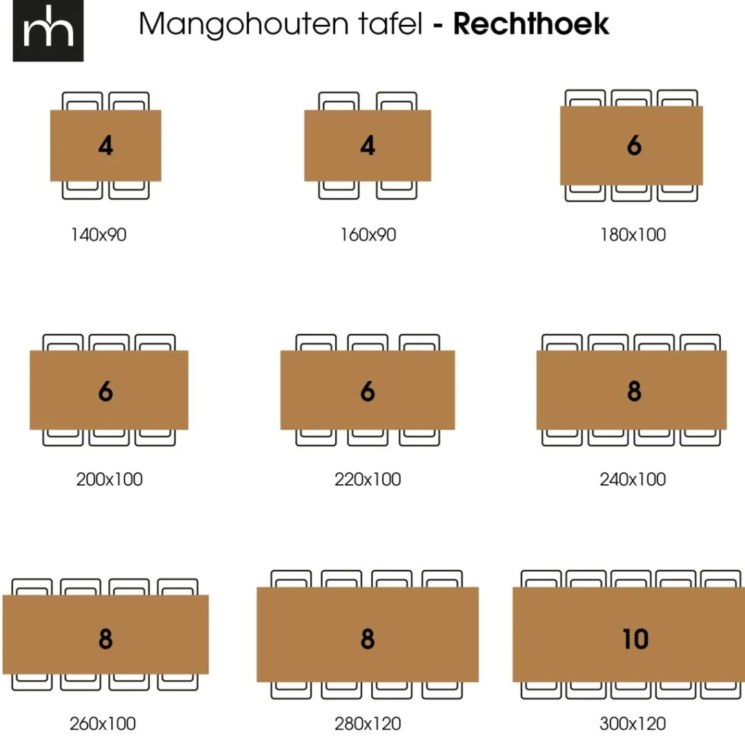 | Style | 140×90 cm (4/6 personen), 160×90 cm (4/6 personen), 180×100 cm (4/6 personen), 200×100 cm (4/6 personen), 220×100 cm (6/8 personen), 240×100 cm (6/8 personen), 260×100 cm (6/8 personen), 280×100 cm (6/8 personen) |