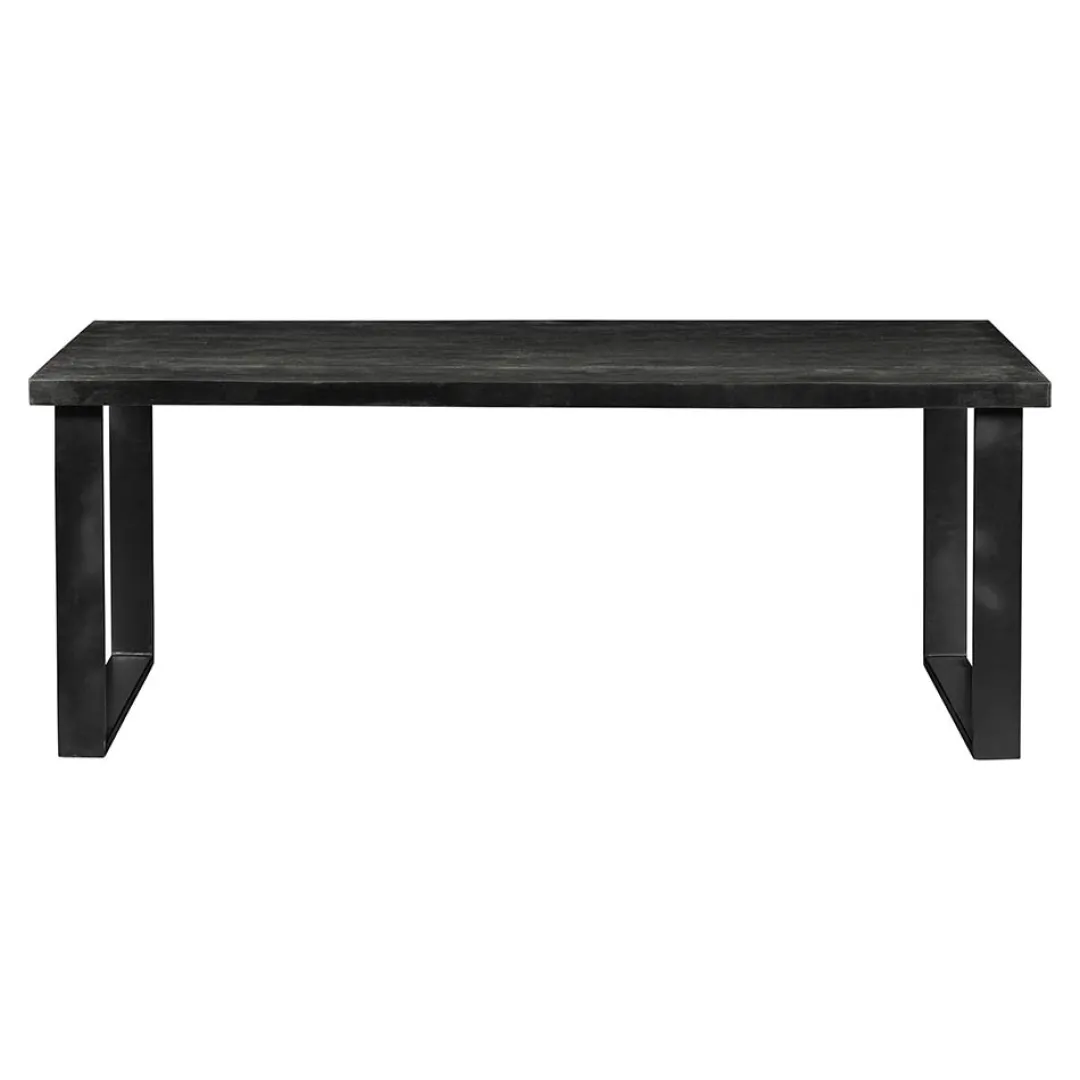 Het blad is eerst gezandstraald, waarna het behandeld wordt met zwarte verfbeits en tenslotte wordt afgewerkt met een donkere, natuurlijke bijenwas om het hout te beschermen tegen vocht, vuiligheid en kringen. De U-poten zijn gemaakt van zwart gepoedercoat metaal.