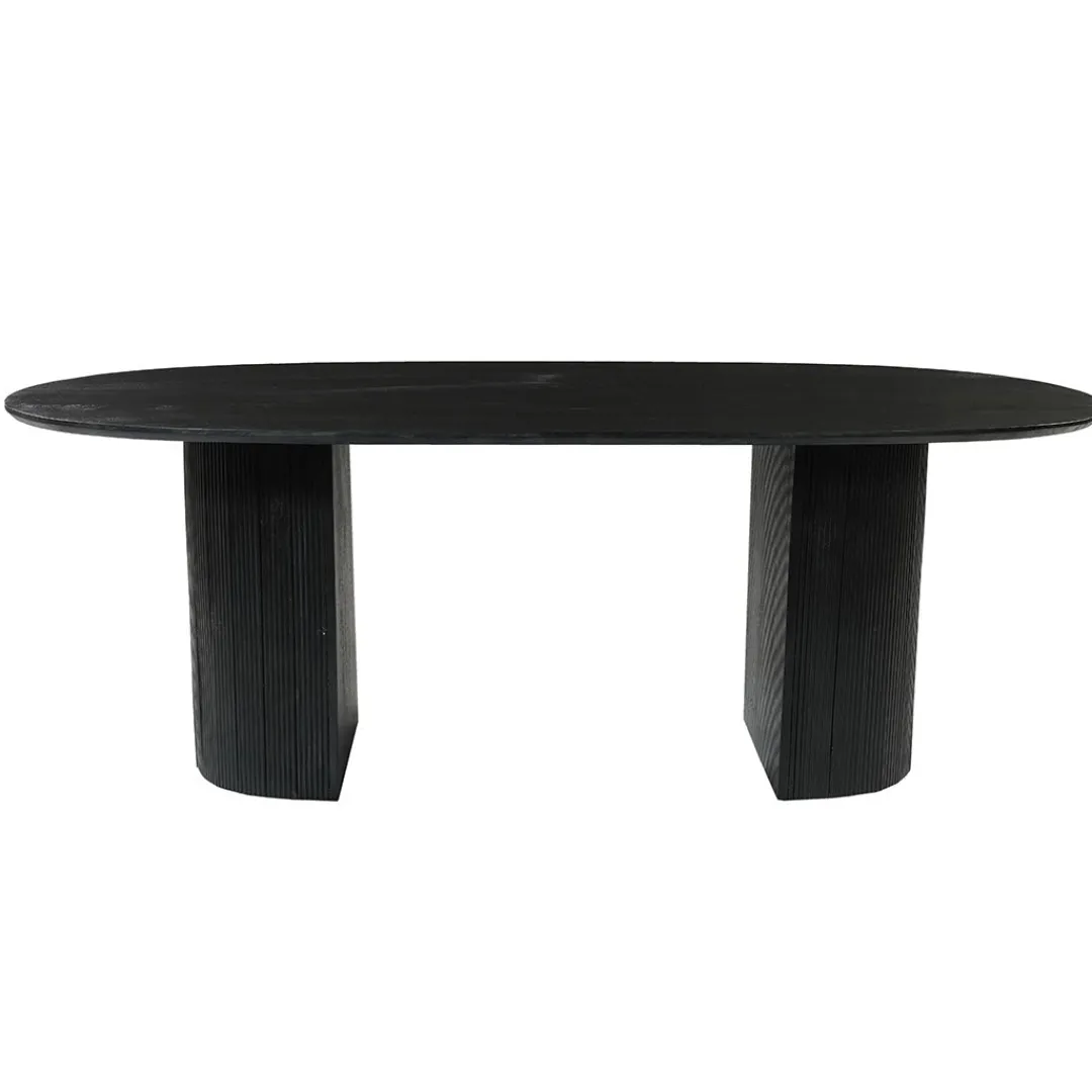 Eettafel Chiara is een stijlvolle toevoeging aan je interieur. Het ovale blad van massief mangohout is afgewerkt in een diepe zwarte kleur, wat de tafel een luxe en moderne uitstraling geeft.