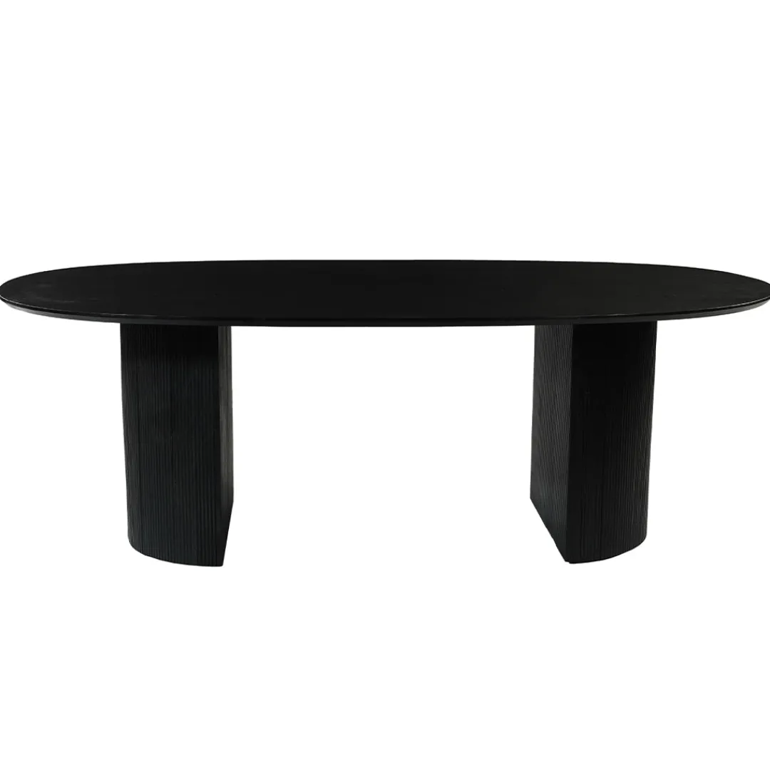 Eettafel Chiara is een elegante aanvulling op je interieur. Het ovale blad van massief mangohout, afgewerkt in een diepe zwarte kleur, zorgt voor een luxe en moderne uitstraling.