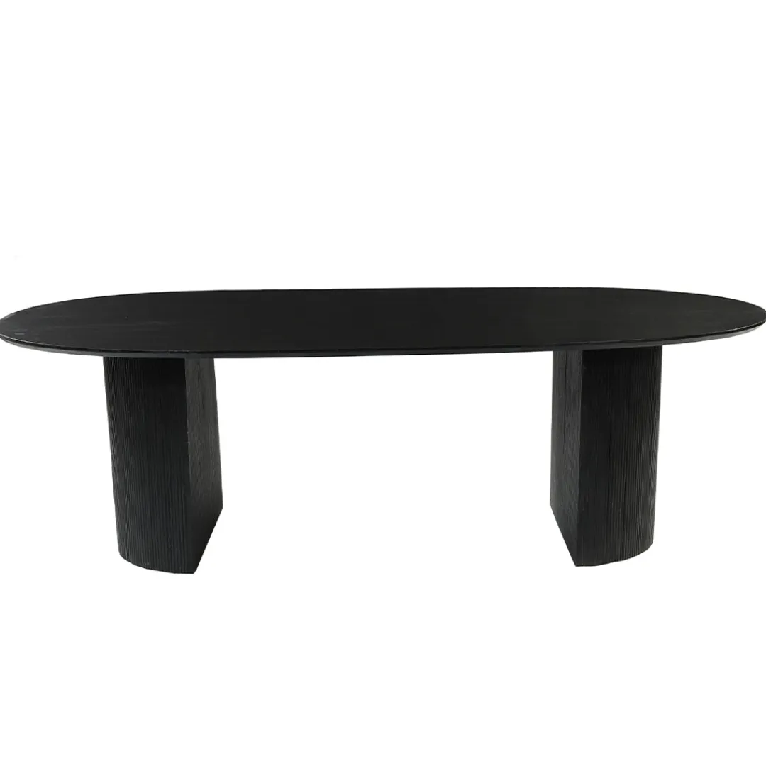 Eettafel Chiara brengt stijl en karakter in je interieur. Het ovale blad van massief mangohout, afgewerkt in een diepe zwarte kleur, geeft de tafel een moderne en luxe uitstraling.