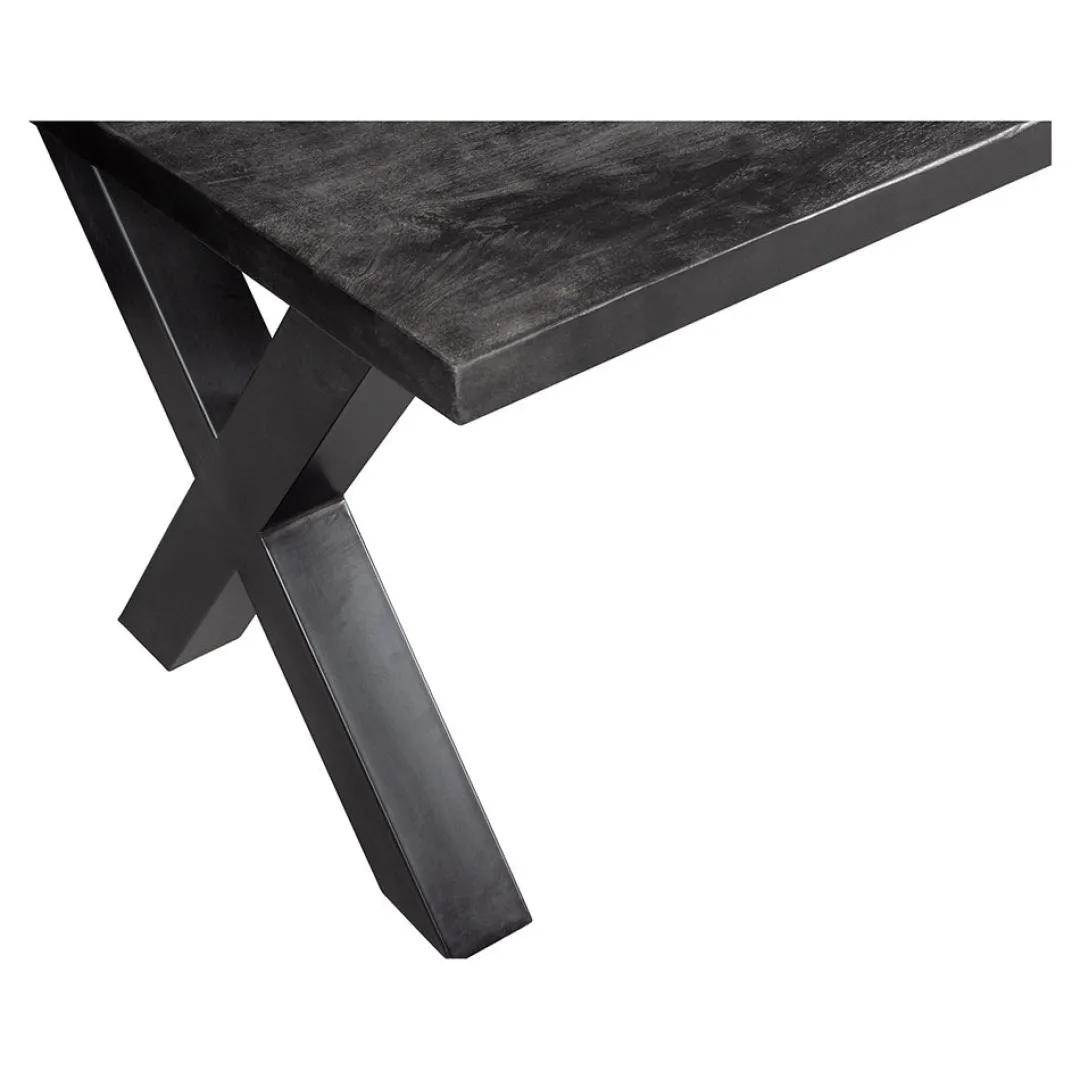 Aan deze stoere eettafel is het niet moeilijk om met een groot gezelschap aan te genieten! De zwarte eettafel heeft een robuust tafelblad dat wordt ondersteund door twee fraaie zwartmetalen x-poten, die de tafel een eenheid laten vormen die je meteen in huis zou moeten hebben!