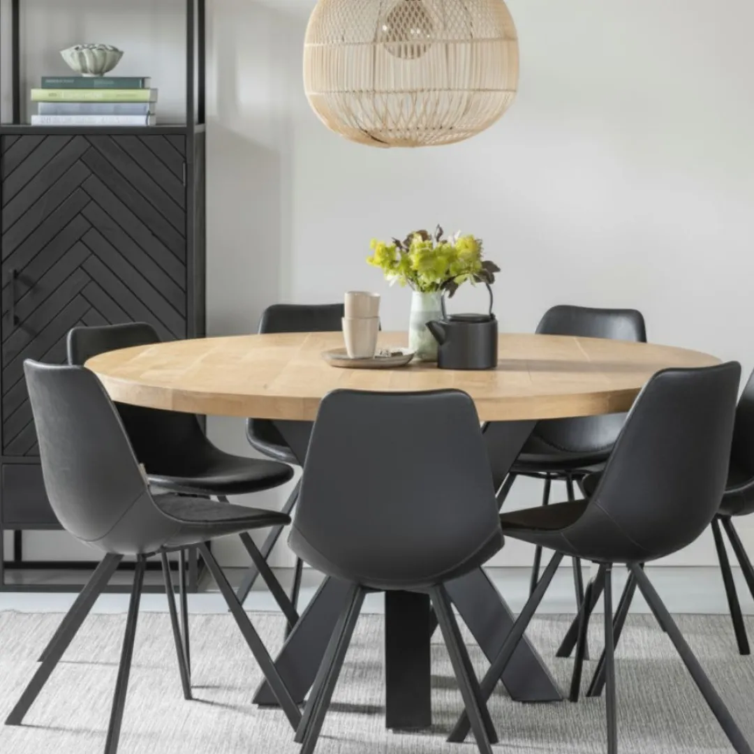 Deze stoere eettafel uit de Madison-collectie is de grootste van zijn serie. Dankzij zijn formaat kan je met een uitgebreid gezelschap van de tafel genieten, terwijl de vorm ervoor zorgt dat iedereen eenvoudig met elkaar in gesprek kan. Zo vormt de tafel de basis voor een heerlijke avond!
