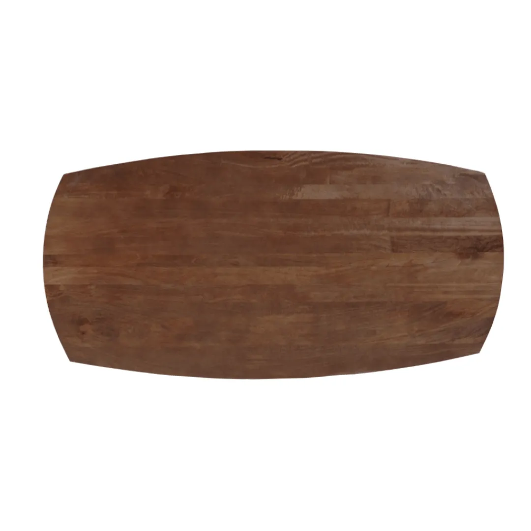 Breng warmte en stijl in je eetkamer met de Eettafel Nova in Deens ovale vorm. Deze prachtige tafel is gemaakt van mangohout en heeft een unieke ronde vorm met een robuuste trompetpoot. Het natuurlijke karakter van het hout geeft elke tafel een eigen uitstraling dankzij de zichtbare nerven en kleurverschillen.