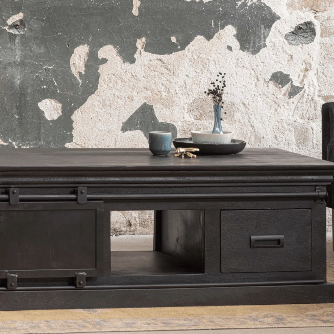 De zwarte Portland salontafel is uniek in zijn soort. Het meubel heeft een robuust uiterlijk en de fraaie combinatie van het stalen deurtje met het zwarte mangohout is de blikvanger van elk interieur. De salontafel heeft twee lades aan de zijkanten om gebruiksvoorwerpen op te ruimen een ook achter de stalen schuifdeur is nog voldoende opbergruimte.