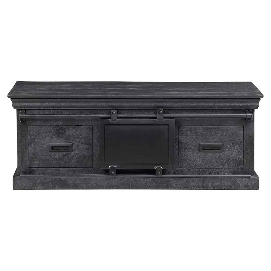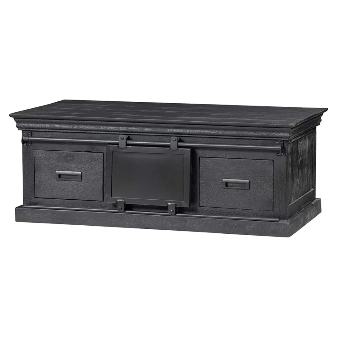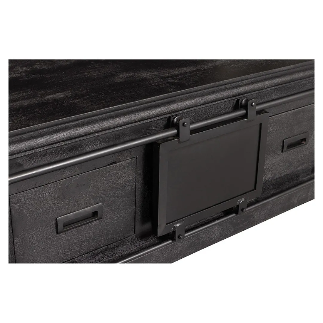 Het mangohout is massief en is eerst gezandstraald, waarna het behandeld wordt met zwarte verfbeits en tenslotte wordt afgewerkt met een donkere, natuurlijke bijenwas om het hout te beschermen tegen vocht, vuiligheid en kringen. De handgrepen, de schuifdeuren en de rails zijn gemaakt van zwart gepoedercoat metaal.