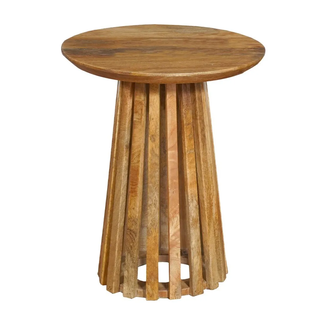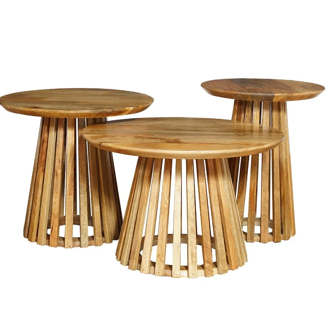 De mangohouten salontafel Ravenna Small voegt een stijlvolle uitstraling toe aan je woonkamer. De spijlenstructuur geeft het ontwerp een eigentijdse look en voegt een unieke touch toe aan je inrichting.