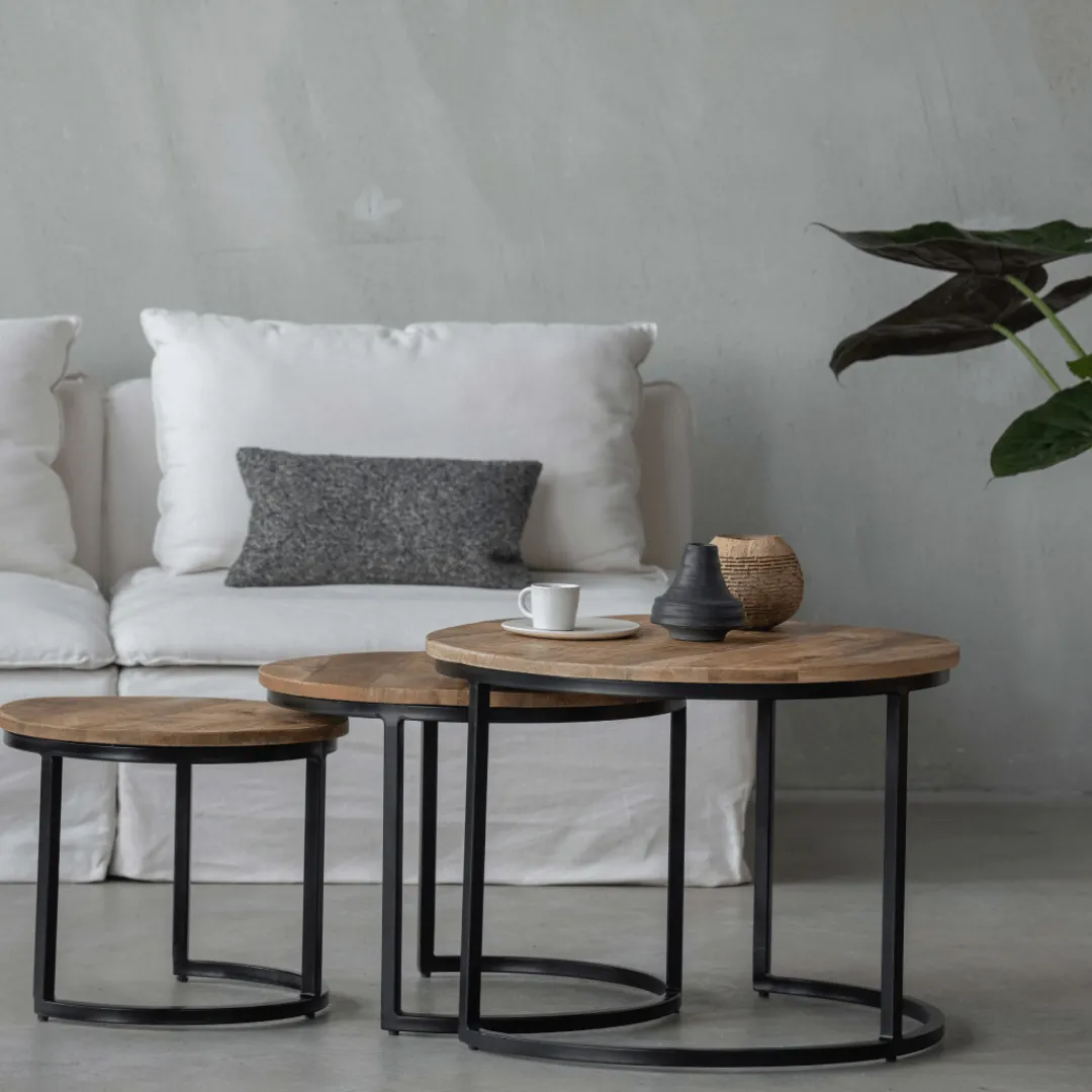 Met deze drie mangohouten salontafels kan je een speelse indeling geven aan jouw interieur. Je kan gemakkelijk zelf bepalen hoe je het beste van deze salontafels kan genieten door ze gewoon als salontafel of als bijzettafel naast de bank te gebruiken.