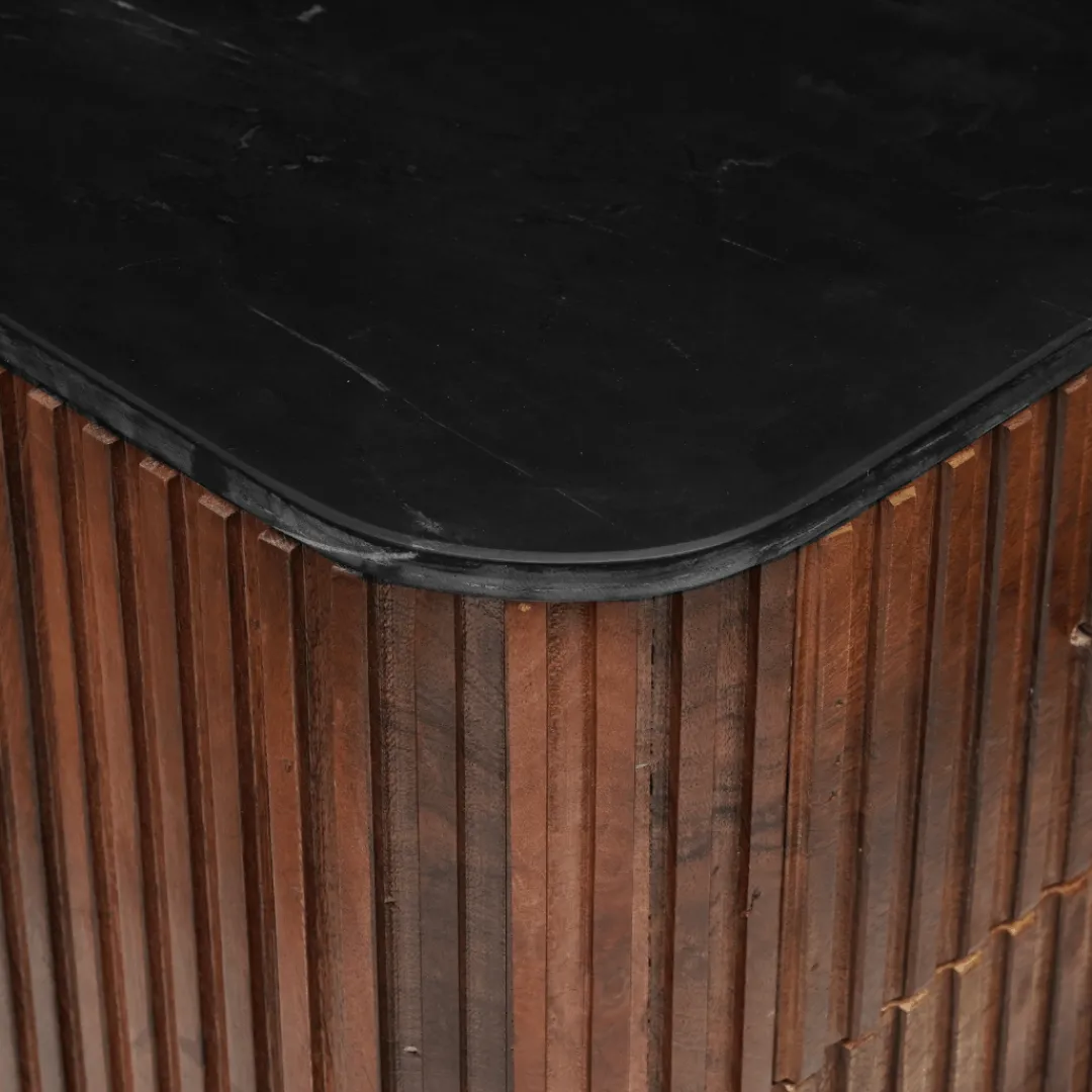 Dit meubel is prachtig vervaardigd in een verfijnde walnootkleur, waardoor de natuurlijke schoonheid van het mangohout wordt benadrukt, terwijl duurzaamheid gewaarborgd blijft. Het marmeren bovenblad voegt een vleugje luxe toe en transformeert dit meubelstuk tot een opvallend middelpunt in elke kamer.