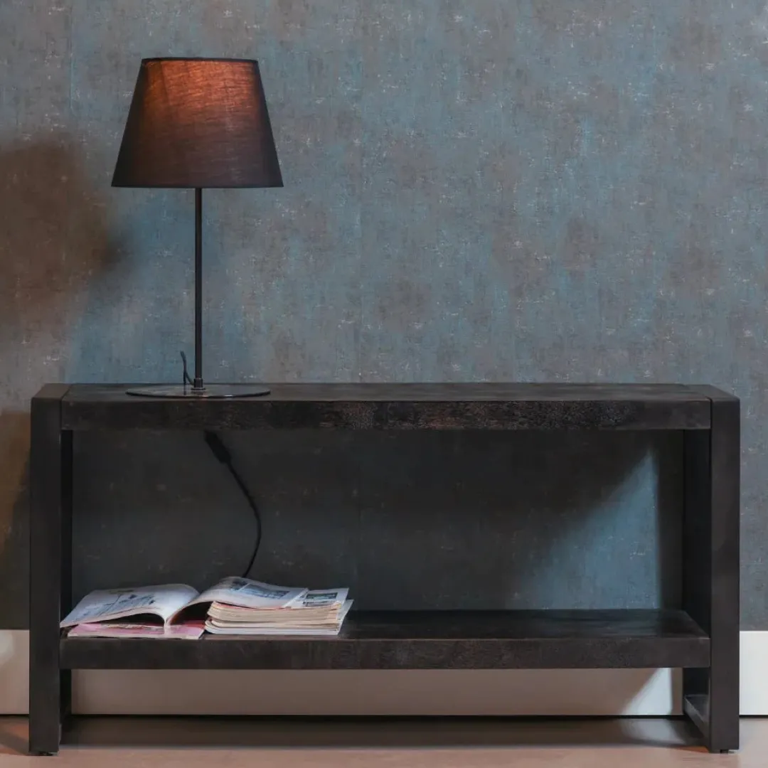 Het massieve mangohout is eerst gezandstraald, daarna behandeld met zwarte verfbeits en tenslotte afgewerkt met een donkere, natuurlijke bijenwas om het hout te beschermen tegen vocht, vuil en kringen. De stalen poten zijn behandeld met een zwarte poedercoating.