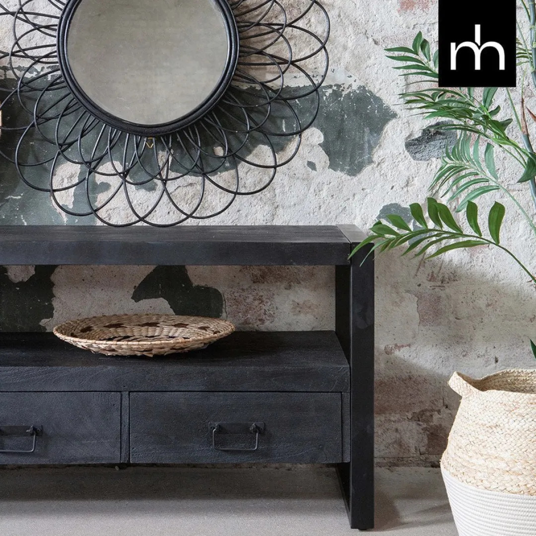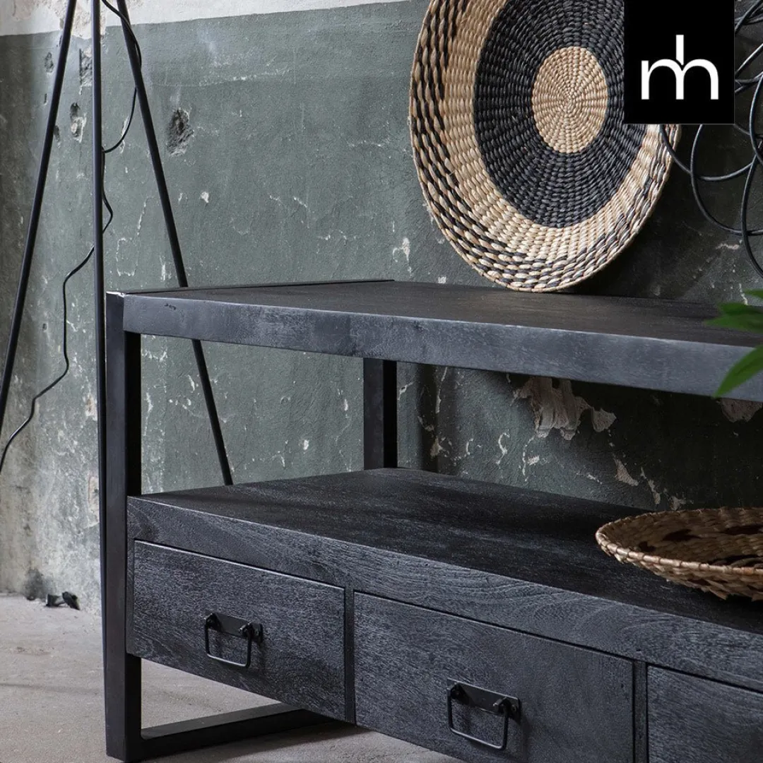 De Mangohouten Britt Black wordt gekenmerkt door zijn bescheiden, maar toch verfijnde ontwerp. De overgang van het zwarte mangohout naar het zwarte metaal is feilloos, waardoor het meubel perfect bij je interieur past. De tussenruimte biedt de mogelijkheid om apparatuur zoals een tv-ontvanger of een geluidsbox neer te zetten en ook de drie lades bieden genoeg opbergruimte voor allerlei gebruiksvoorwerpen.