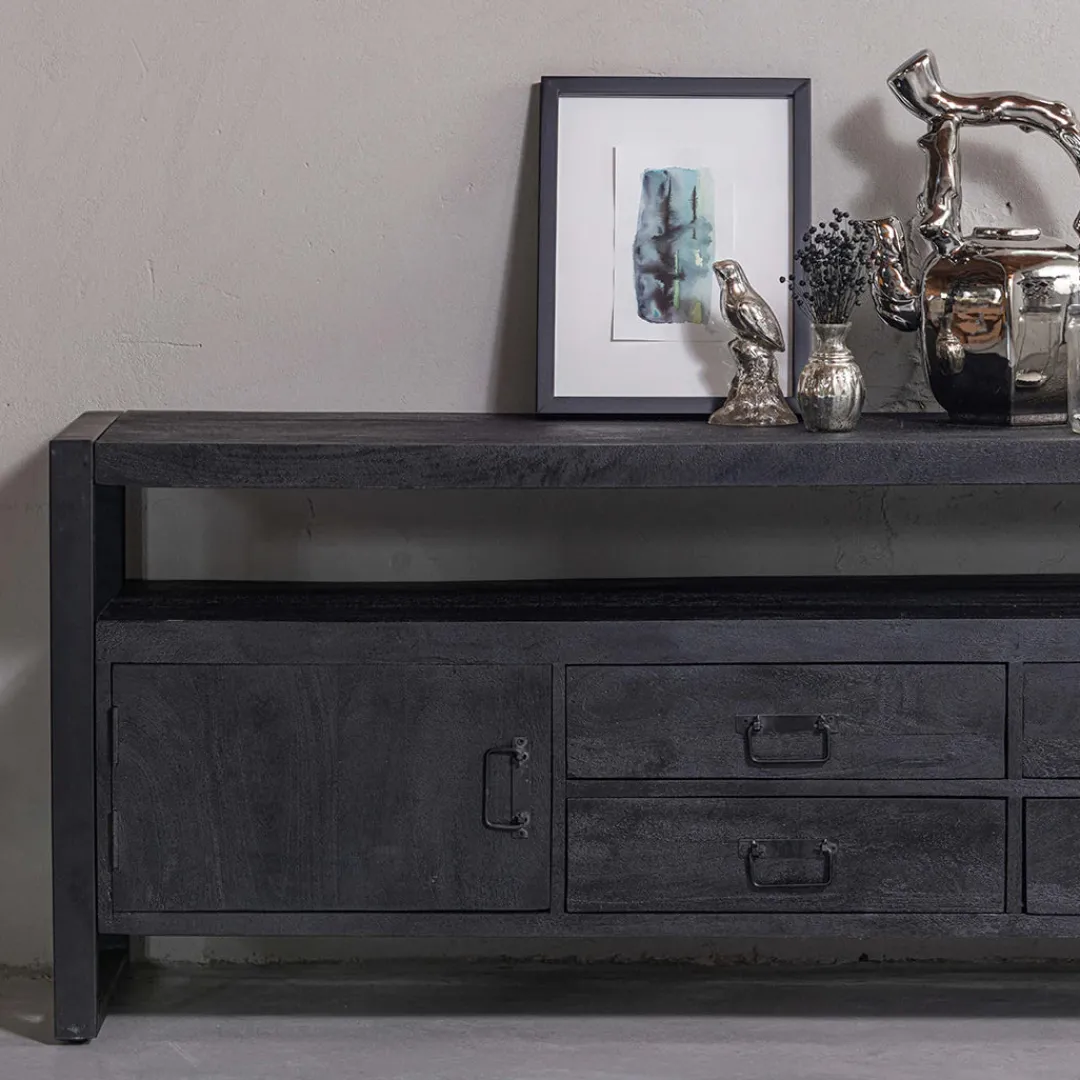 Het mangohout is massief en is eerst gezandstraald, waarna het behandeld wordt met zwarte verfbeits en tenslotte wordt afgewerkt met een donkere, natuurlijke bijenwas om het hout te beschermen tegen vocht, vuiligheid en kringen. De frames en de handgrepen zijn gemaakt van zwart gepoedercoat metaal.