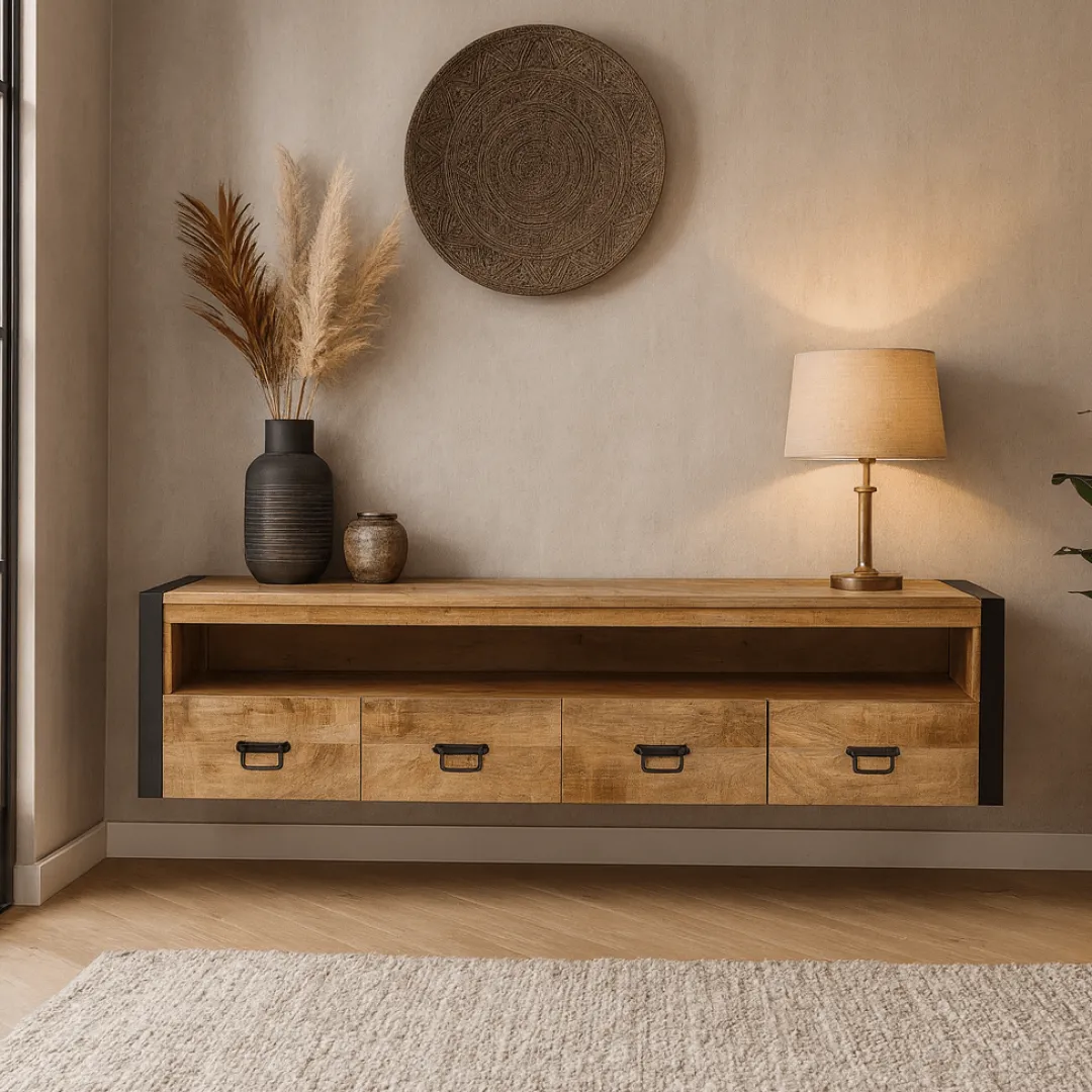 Het zwevende tv-meubel Britt is dé blikvanger voor een modern of industrieel interieur. Gemaakt van massief mangohout in combinatie met zwart metalen accenten, straalt dit meubel karakter en robuustheid uit. De drie ruime lades bieden handige opbergruimte voor afstandsbedieningen, kabels of accessoires, terwijl het open vak perfect is voor je mediabox of spelcomputer. Dankzij het zwevende ontwerp houd je eenvoudig je vloer schoon én oogt je woonkamer ruimer.