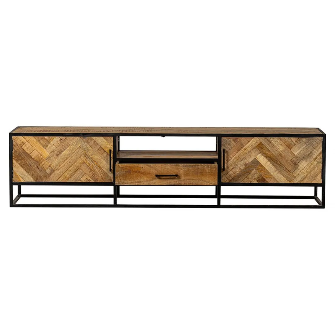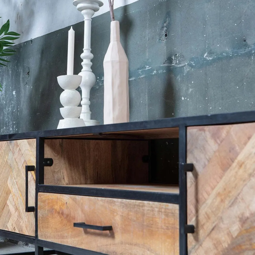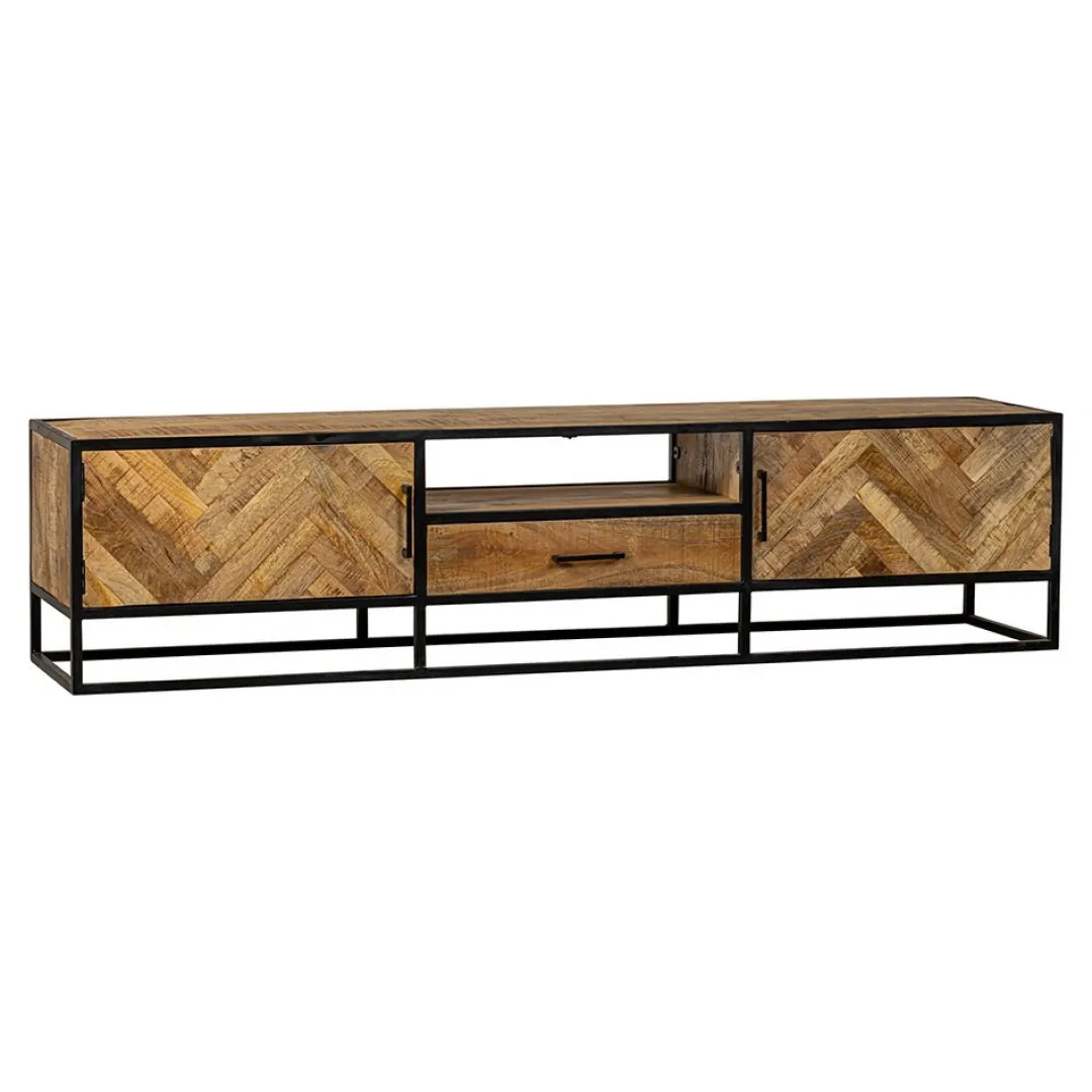 Het grote TV meubel New Haven is stoer, robuust en elegant tegelijk. De deurtjes van het meubel zijn afgewerkt met een visgraatpatroon, waardoor de kast zijn stijlvolle karakter krijgt. De kast beschikt over een ruime lade, met daarboven een handig open vak om apparaten neer te zetten, terwijl de kabels aan de achterkant kunnen worden weggestopt. Aan beide uiteinden zitten twee ruime vakken achter ieder deurtje om allerlei objecten eenvoudig op te bergen.