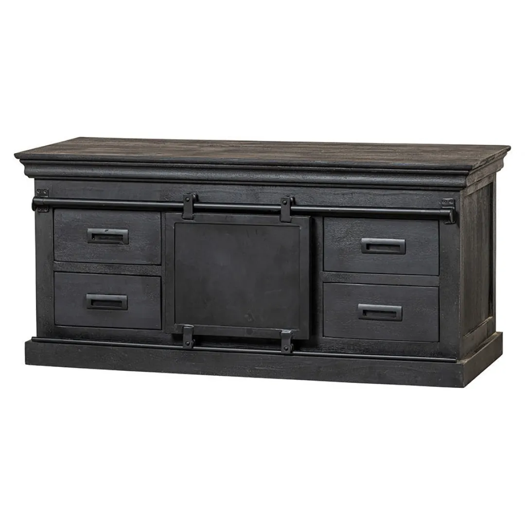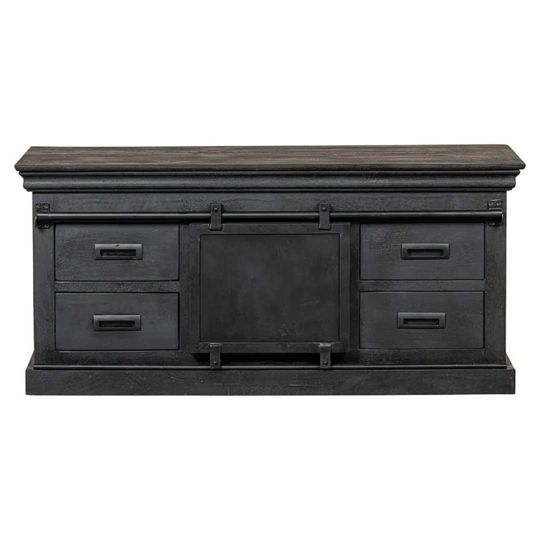 Het mangohout is massief en is eerst gezandstraald, waarna het behandeld wordt met zwarte verfbeits en tenslotte wordt afgewerkt met een donkere, natuurlijke bijenwas om het hout te beschermen tegen vocht, vuiligheid en kringen. De schuifdeur, de rails en de handgrepen zijn gemaakt van zwart gepoedercoat metaal.