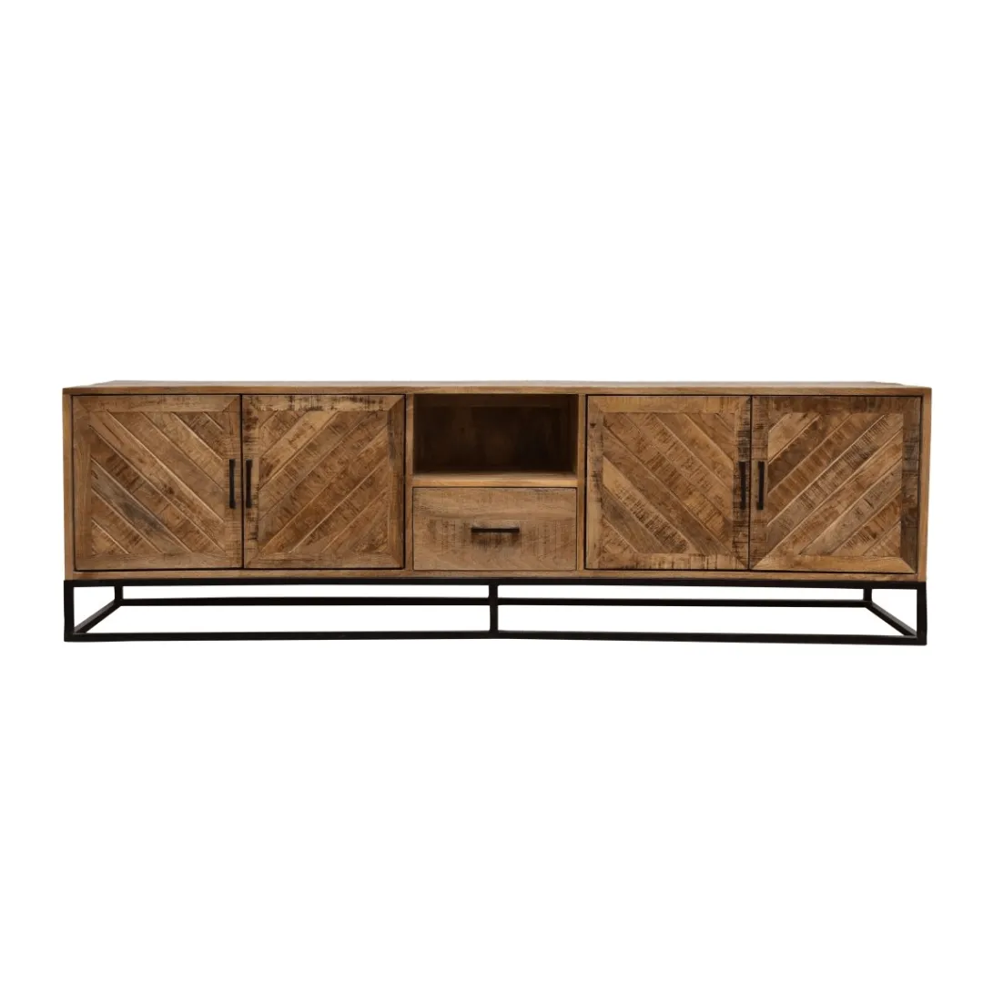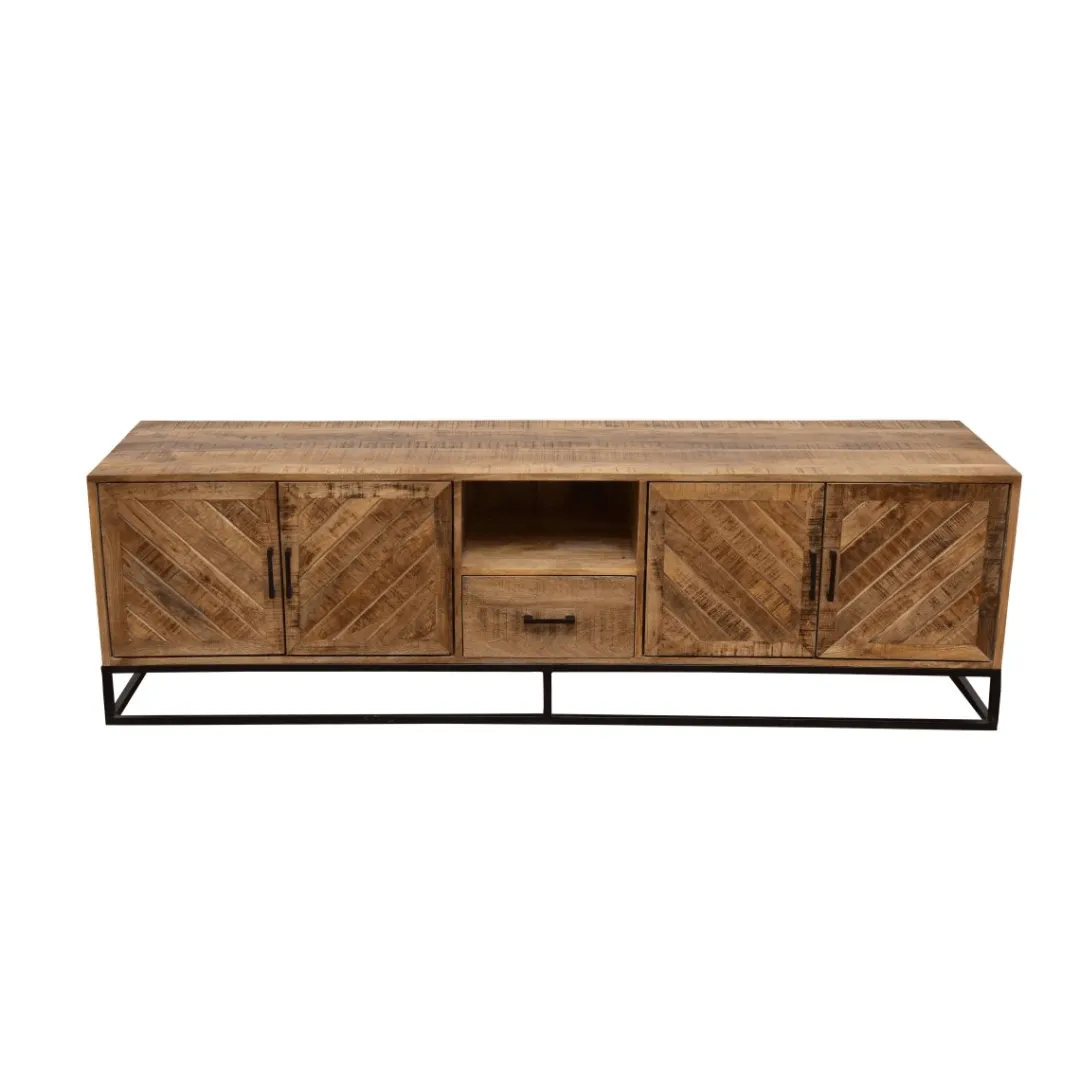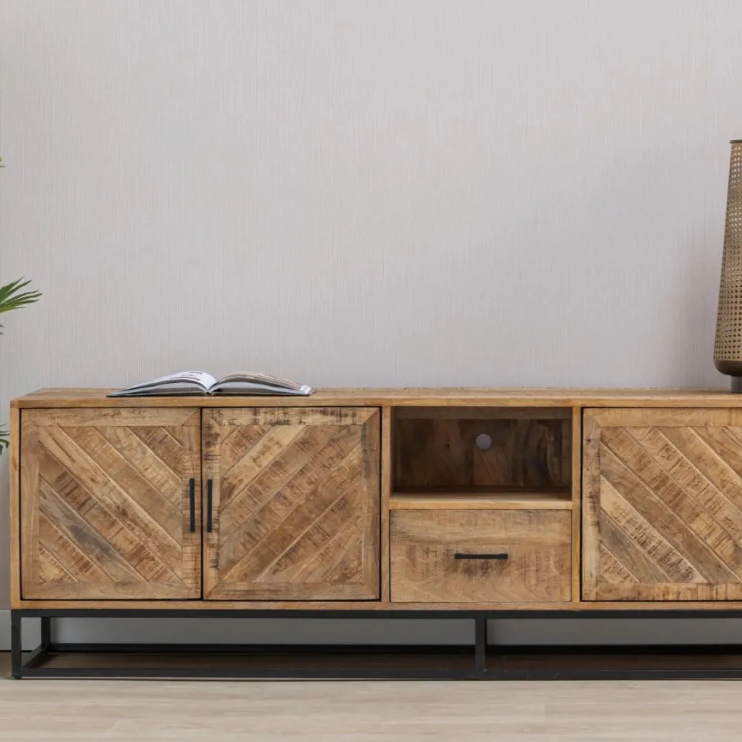Maak de woonkamer helemaal compleet met het stoere TV Meubel Reno! Het meubel heeft een robuust, stijlvol karakter waarmee het meubel direct op zal vallen in jewoonkamer. Het open vak is een mooie plek om apparatuur te plaatsen. De lade daaronder biedt ruimte voor kleinere voorwerpen, terwijl er in de vakken achter de deurtjes veel plek is om je grotere spullen in de buurt van de televisie op te bergen.