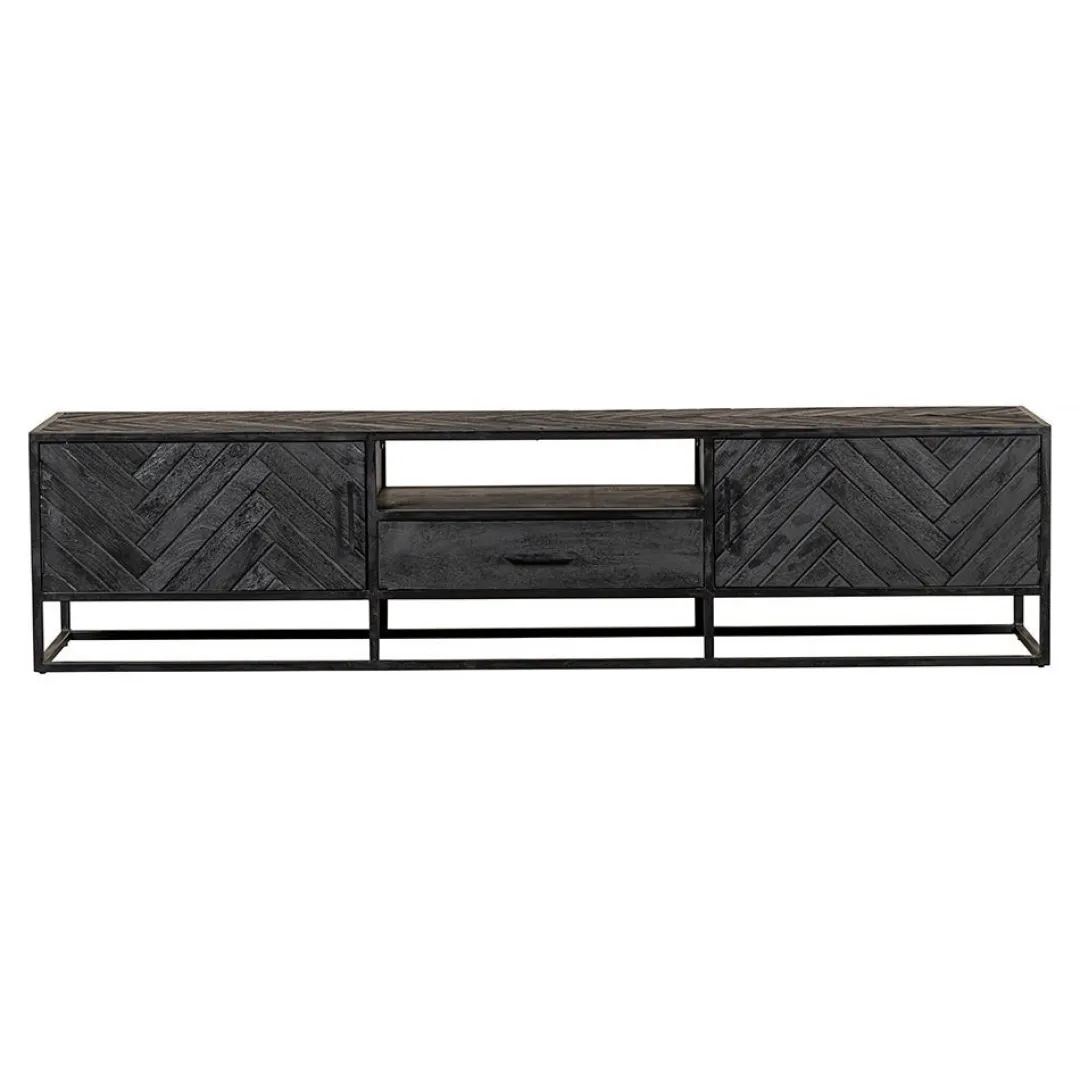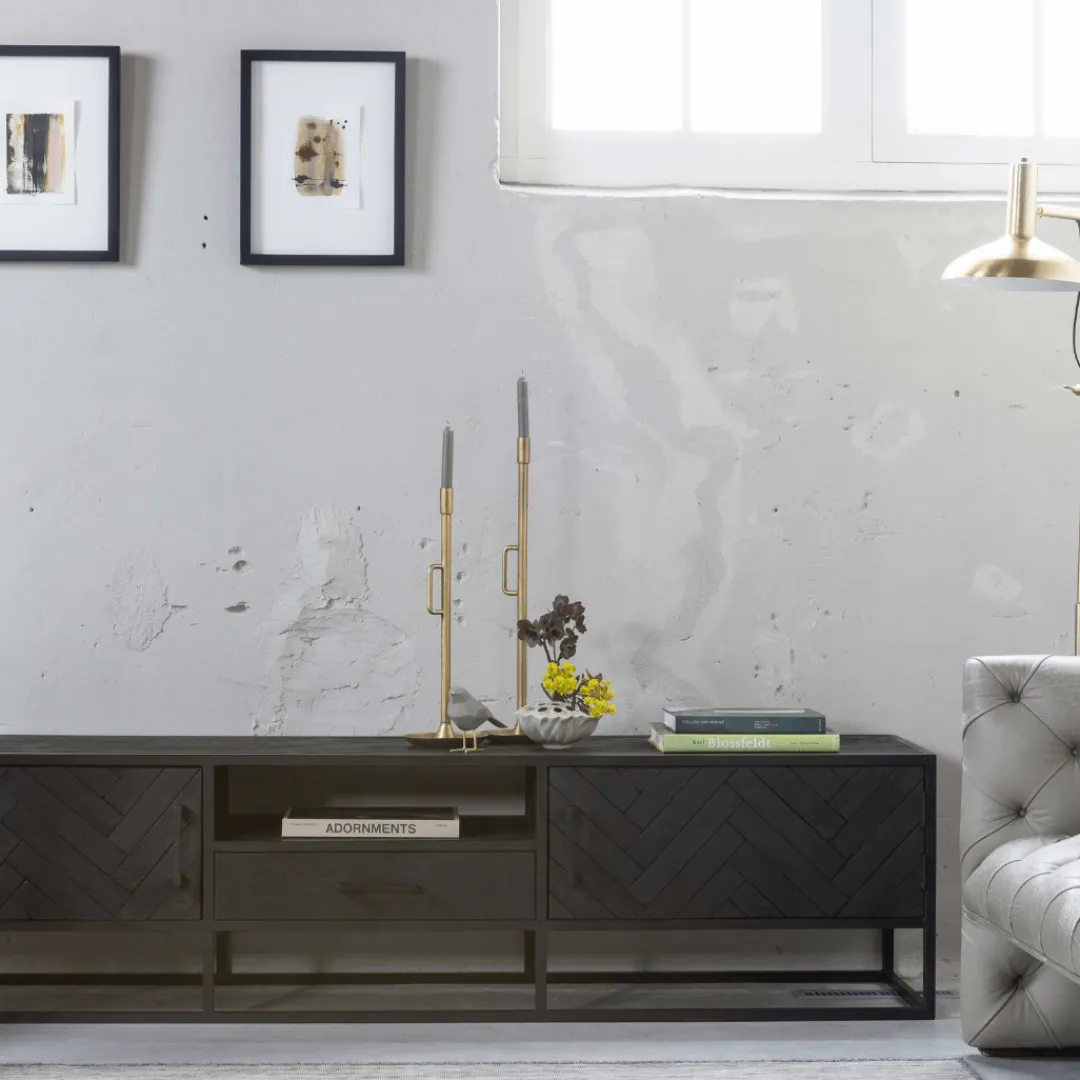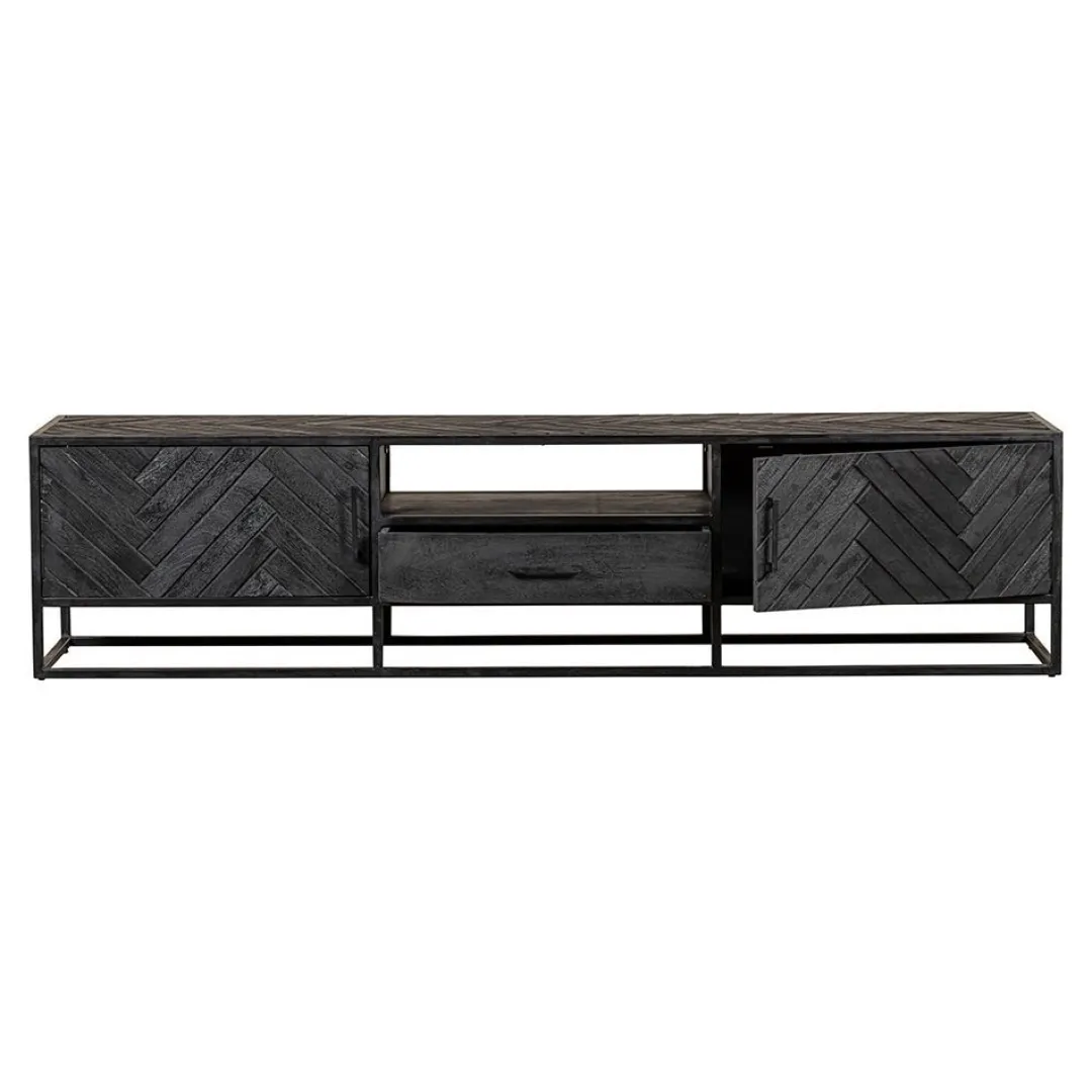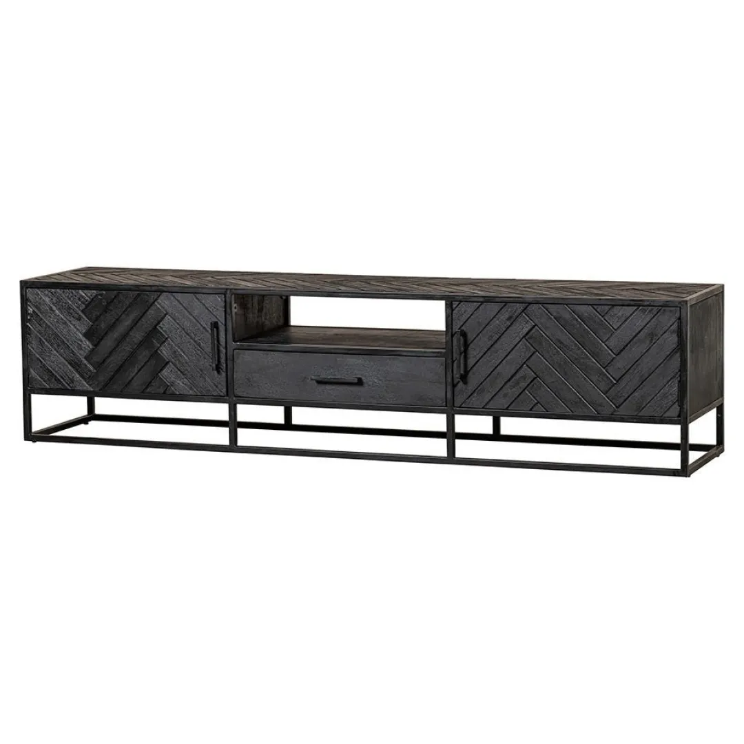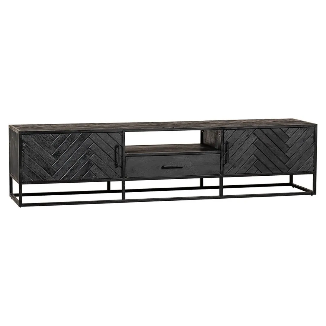 Dit zwarte televisiemeubel uit de Sienna-serie is anders dan onze andere TV meubels doordat hij bewerkt is met een visgraat motief. Dit geeft de kast een zeer chique uiterlijk dat meteen opvalt in de ruimte. In het open vak is veel ruimte voor apparatuur en de kabels kunnen eenvoudig aan de achterkant worden weggewerkt. Achter de twee ruime deurtjes is veel ruimte voor DVD’s, CD’s en computerspellen en ook in de lade kunnen allerlei accessoires worden opgeborgen.