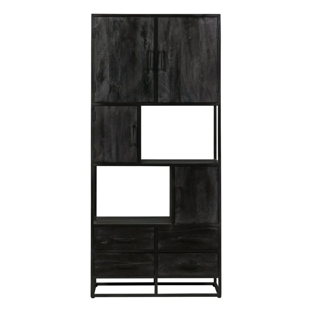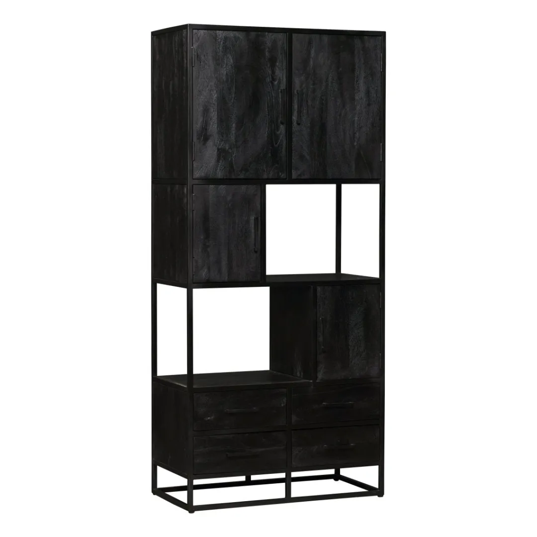 Speels en stijlvol met een fantastische uitstraling! De smalle vakkenkast Florence barst van de mogelijkheden. Het unieke design van de kast is gecombineerd met een chique combinatie van zwart mangohout en metaal, wat het meubel perfect laat passen in een industrieel interieur. Met zijn vier kastjes, twee open vakken en vier lades kan je van alles in de kast opbergen.