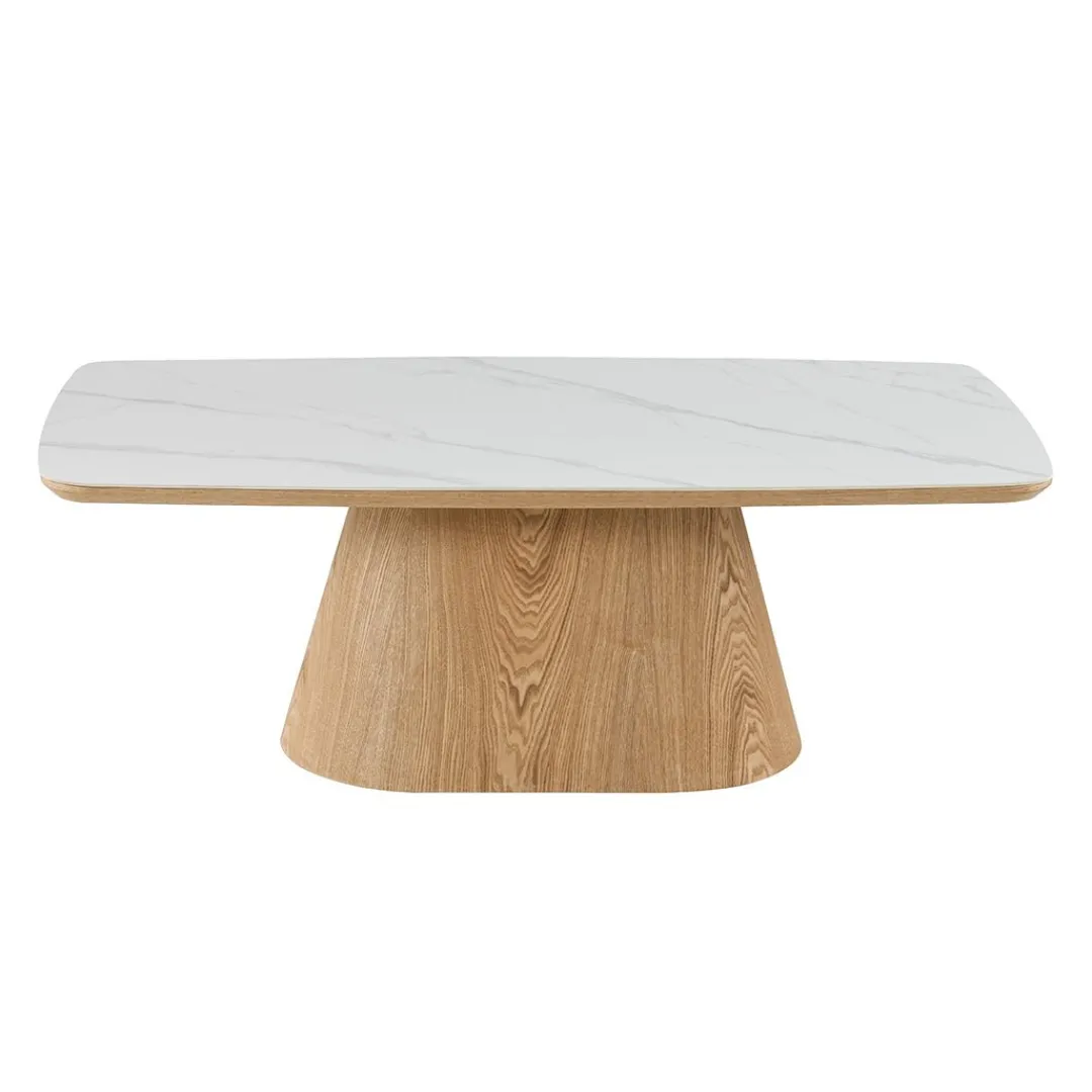 Salontafel Santiago combineert een moderne uitstraling met natuurlijke warmte. Het blad is uitgevoerd in naturel woodvineer en afgewerkt met een verfijnde laag wit marmer. Deze stijlvolle combinatie maakt de tafel tot een echte blikvanger in je interieur.
